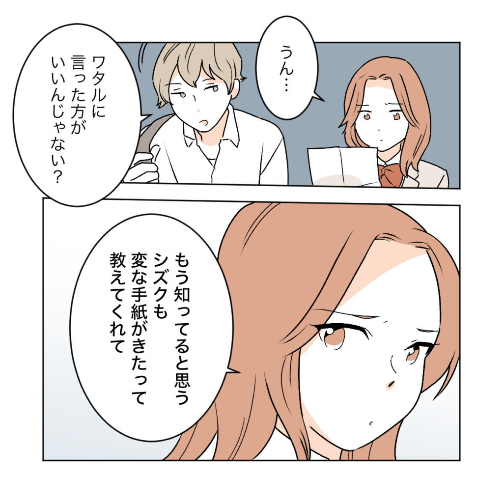 ショウマは「ワタルに言った方がいいんじゃない?」と言いますが、「もう知ってると思う。シズクも、変な手紙がきたって教えてくれて。」とカエデは答えました。
