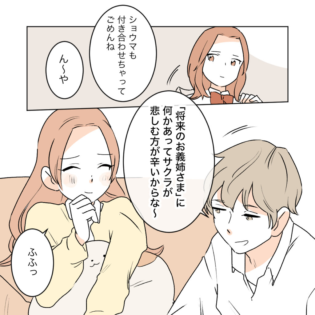「ショウマもつき合わせちゃってごめんね」とカエデ。実は、ショウマと付き合っているのはカエデではなく妹のサクラだったのです。「『将来のお義姉さま』に何かあってサクラが悲しむ方が辛いからな~」と、ショウマはクレーンゲームで勝ち取ったぬいぐるみを抱きかかえるサクラの隣で笑いました。