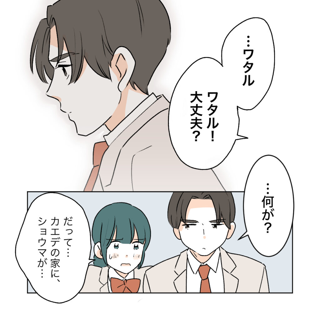 シズクと一緒の帰り道で、カエデに借りたノートを返したいと言うシズクに付き合ってカエデの家に寄ったワタル。するとカエデの後ろからショウマが顔を出したのでワタルは絶句しました。ショウマはカエデの妹サクラと付き合っていて、近頃カエデに嫌がらせの手紙が届くようになったため一緒に帰るようにしていたのですが、その事実を知らないワタルには、噂通りカエデとショウマが付き合っているのだと信じるのに十分な光景でした。