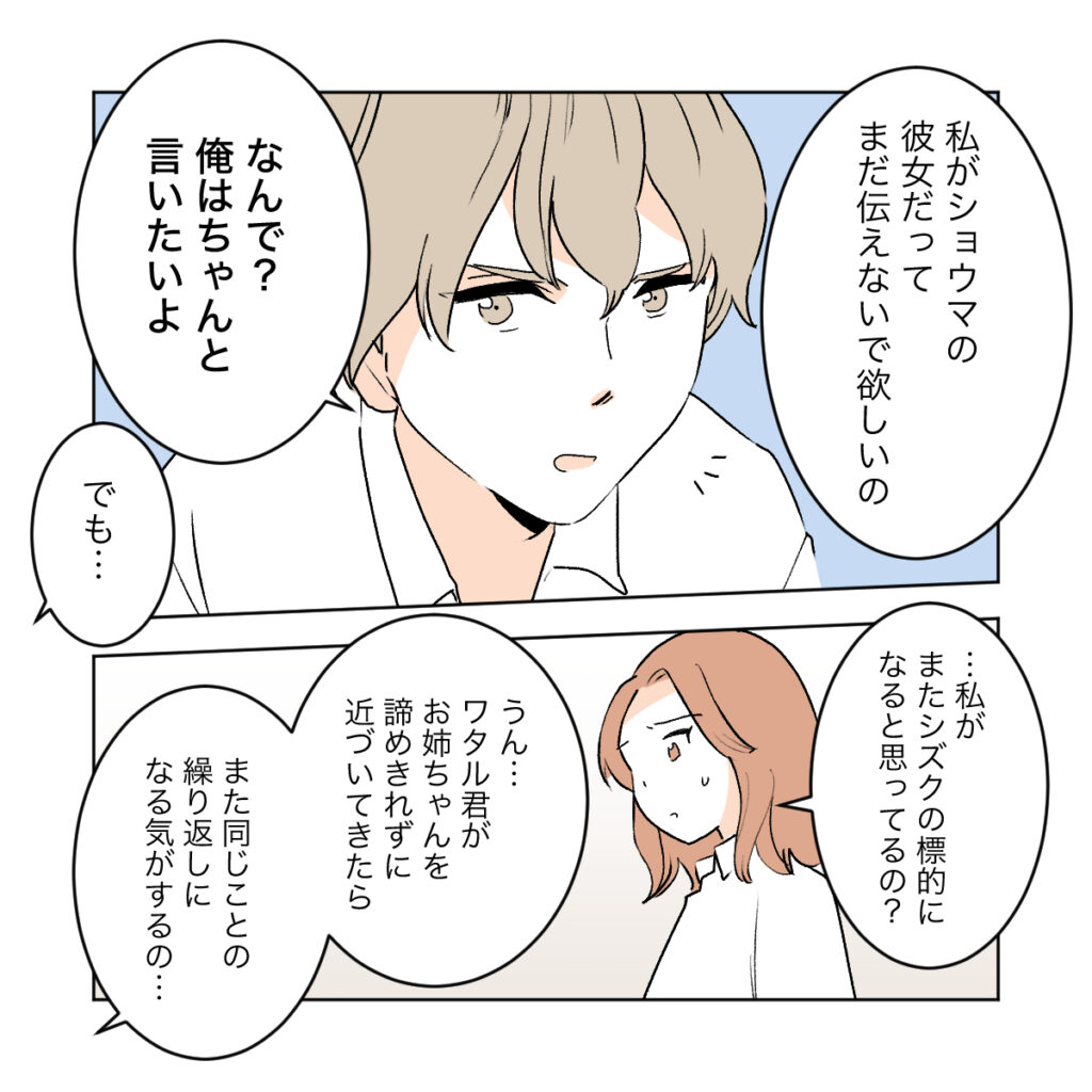 『ワタルに近づくな』と脅す手紙。もしワタルとシズクが付き合っているのなら、もうカエデには嫌がらせの手紙は届かなくなるし、これ以上サクラに危害が及ぶこともなくなるはずだと考えたサクラ、ショウマ、そしてカエデ。そこで、ショウマがワタルに単刀直入に聞いてみることになりました。サクラは「私がショウマの彼女だってまだ伝えないで欲しい」とショウマに念を押しました。ちゃんと言いたいショウマですが、サクラには何か思うところがあるようです。「私がまたシズクの標的になると思ってるの?」とカエデが聞いてみると「うん。ワタル君がお姉ちゃんを諦めきれずに近づいてきたら、また同じことの繰り返しになる気がするの・・・」とサクラは言いました。