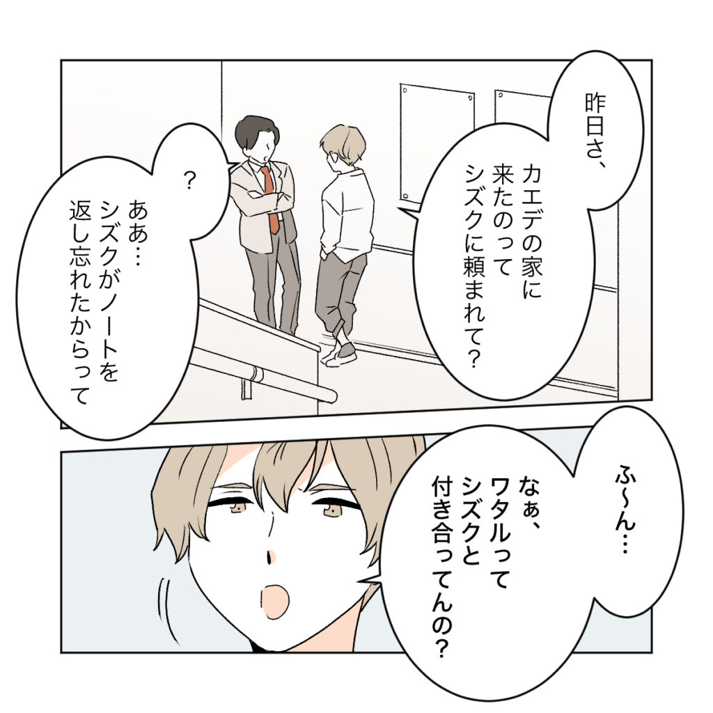 ショウマはまず、カエデの家に来たのがシズクに頼まれてのことだったのかを確認して、シズクがカエデのノートを返し忘れたからだと言っていたことがわかりました。そして「なぁ、ワタルってシズクと付き合ってんの?」とズバリ聞きました。