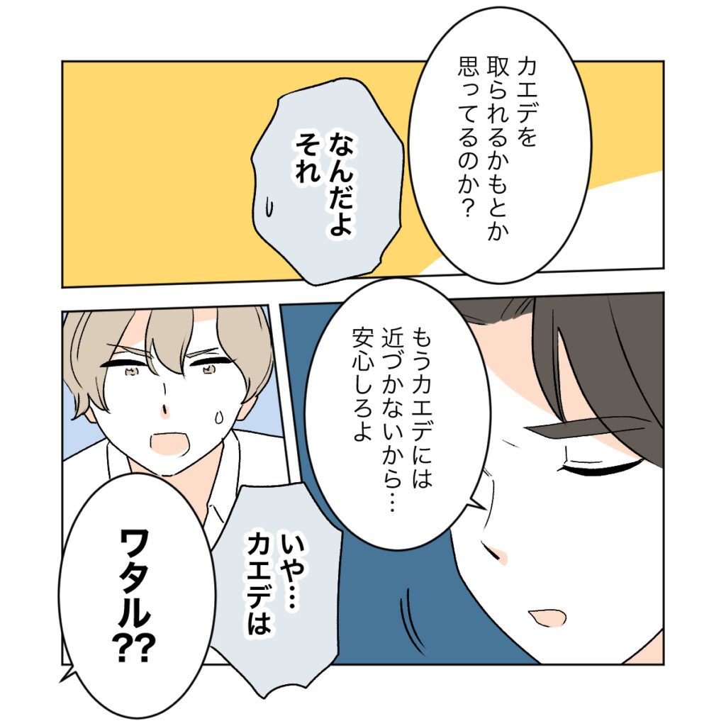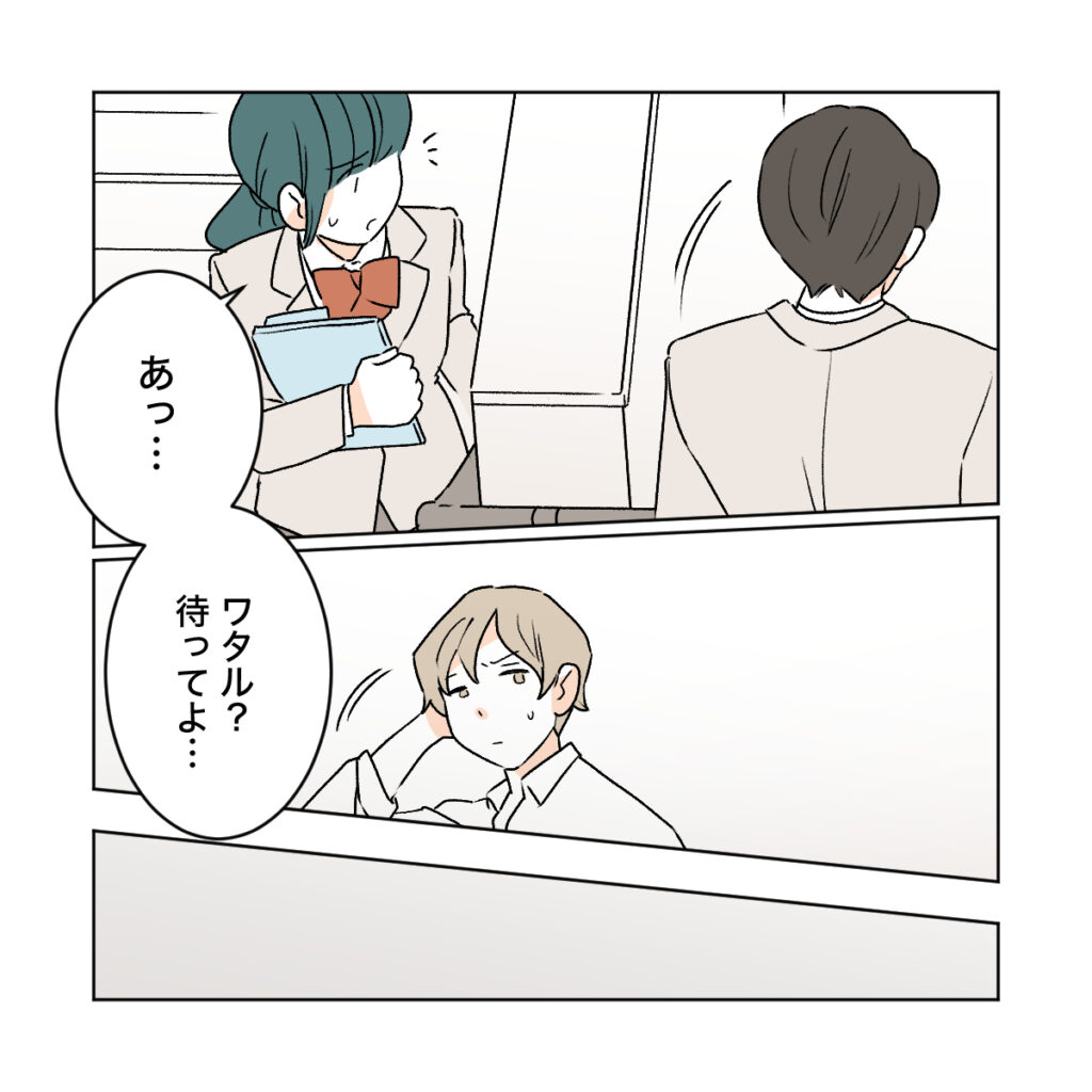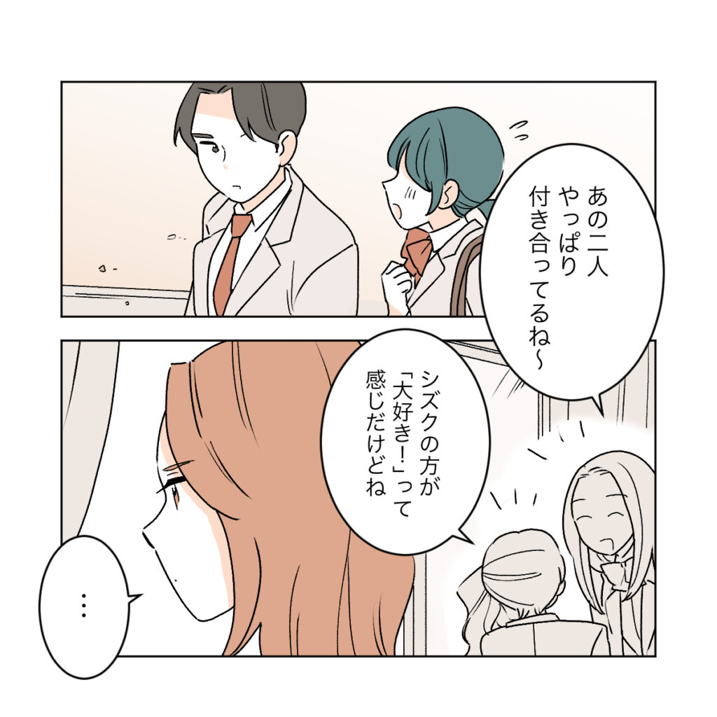 校庭で話すワタルとシズクの姿を、教室の窓から見た女子たちが「あの2人やっぱり付き合ってるね~」「シズクの方が大好き!って感じだけどね」と噂しているのを聞きながら、カエデは無言でワタルとシズクの様子をみていました。