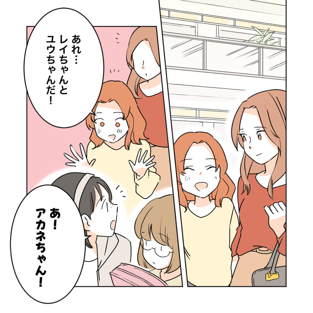 ある日カエデがアカネを連れてショッピングモールへ行くと、偶然同じクラスのレイちゃんとユウちゃんに会いました。嬉しくなってすぐに声をかけるアカネ。