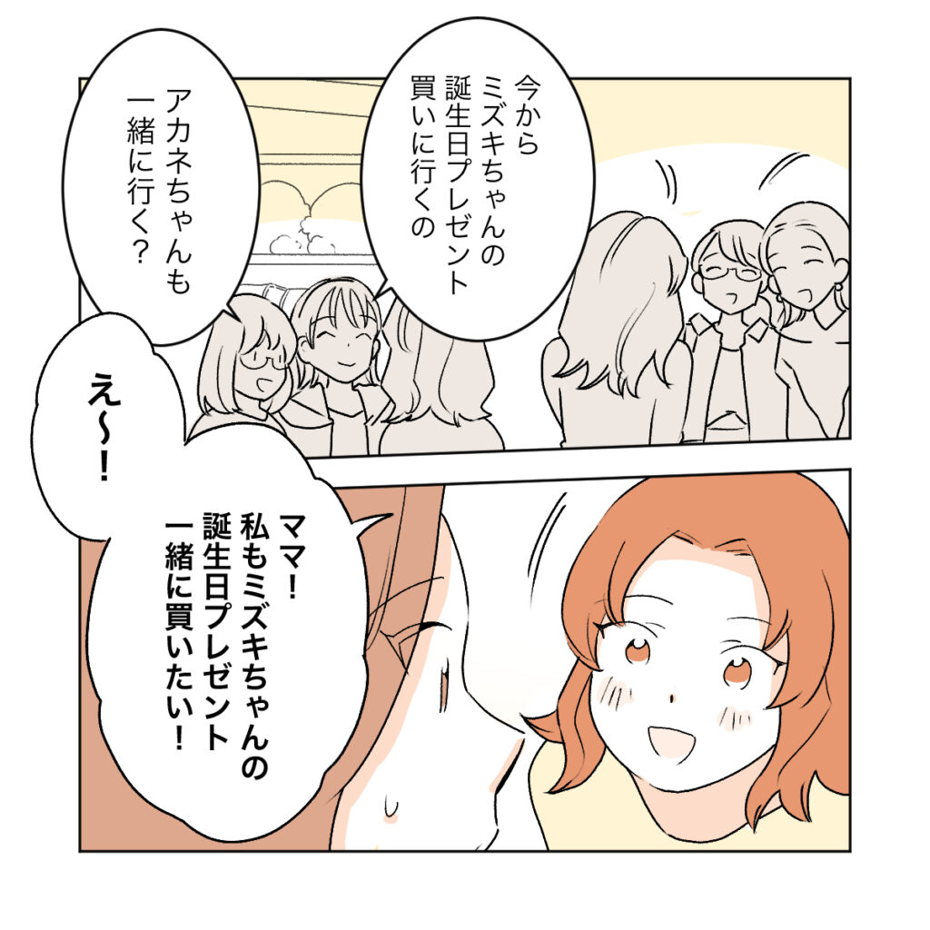 ミズキの誕生日プレゼントを買いに来たと言う2人に誘われて、アカネはもちろん参加したがりました。キラキラした目で「私もミズキちゃんの誕生日プレゼント一緒に買いたい!」と言われて、ダメとは言えず口ごもるカエデ。