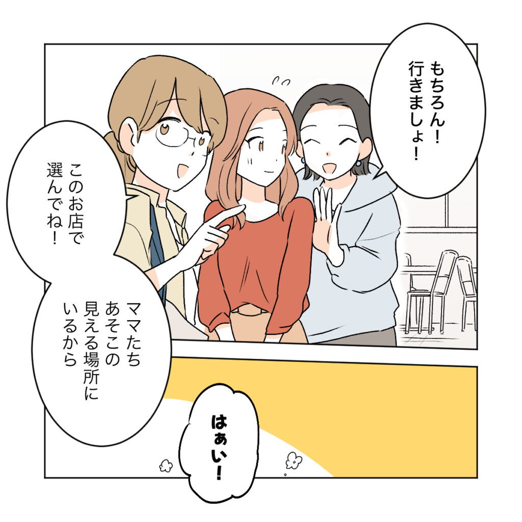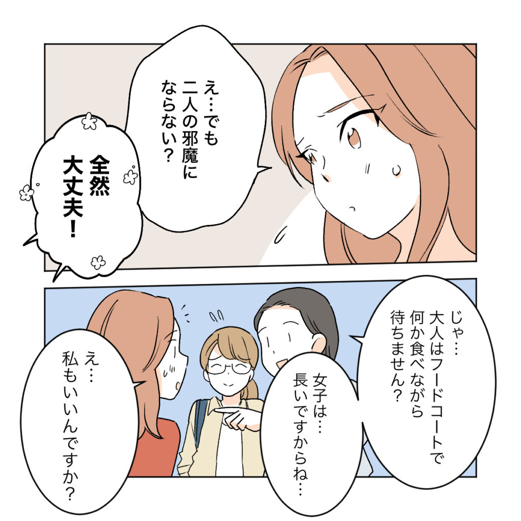 突然の飛び入りで邪魔にならないか遠慮したカエデでしたが、レイちゃんとユウちゃんのママたちは喜んでカエデとアカネを迎えました。そしてママたちはすぐそばのフードコートでお茶しながら娘たちの買い物が終わるのを待つことにしたのです。
