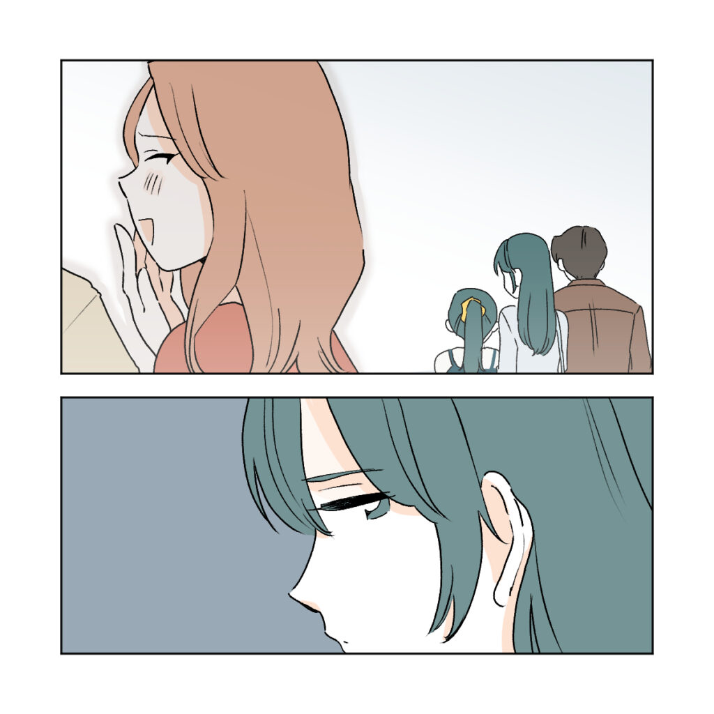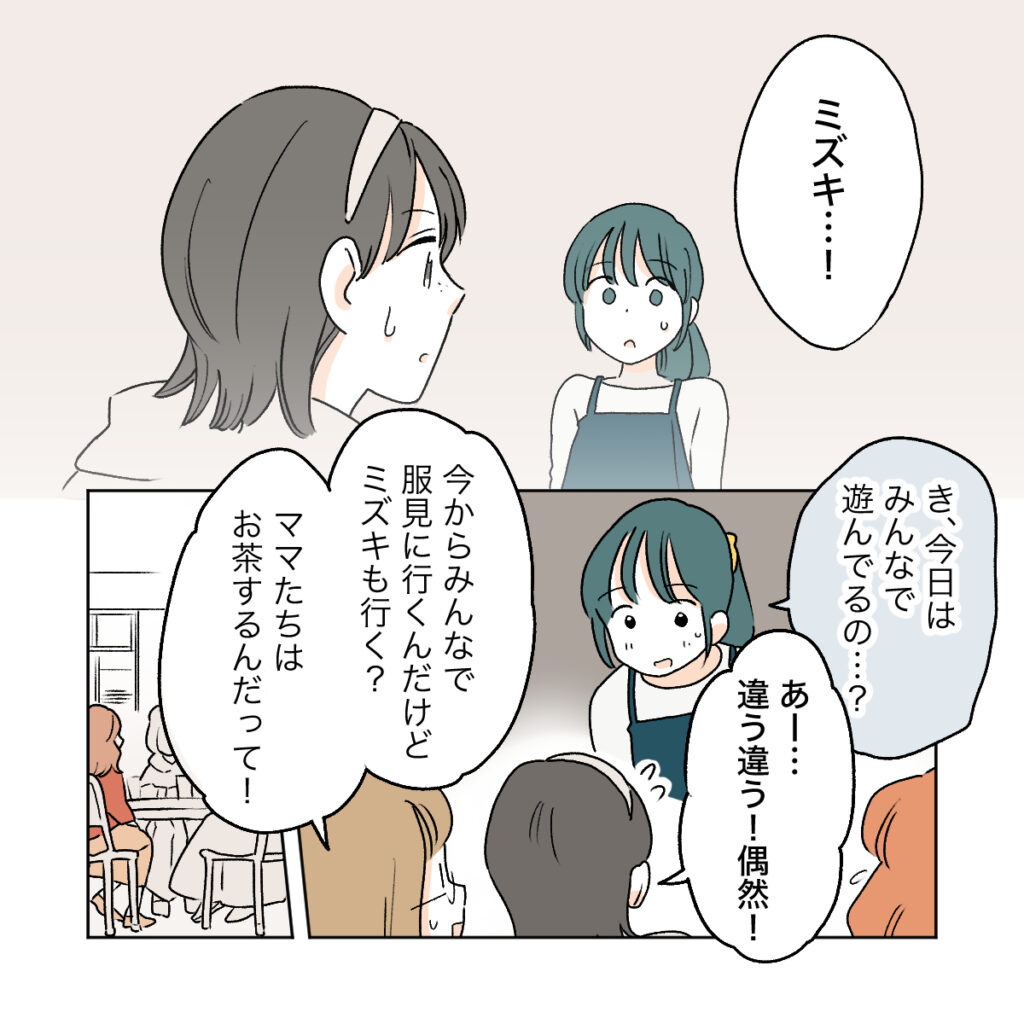 子ども達の様子を見ていたシズクは「偶然だよ」と落ち込むミズキに明るく言いましたが、少し離れた場所でママ友達とお茶して楽しそうに笑うカエデが見えて、親子ともども仲間外れにされたのかな、とチラリと思いました。