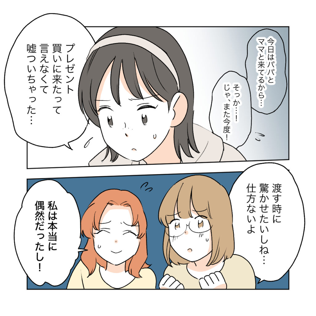 ミズキは家族で来ているからと断りつつも、誘われていなかったことにショックを受けました。一方レイちゃんとユウちゃん、そしてアカネも、友達に嘘をついてしまったことに動揺していました。それでも誕生日プレゼントを渡すときに驚かせたいと、子どもたちなりに考えた結果です。