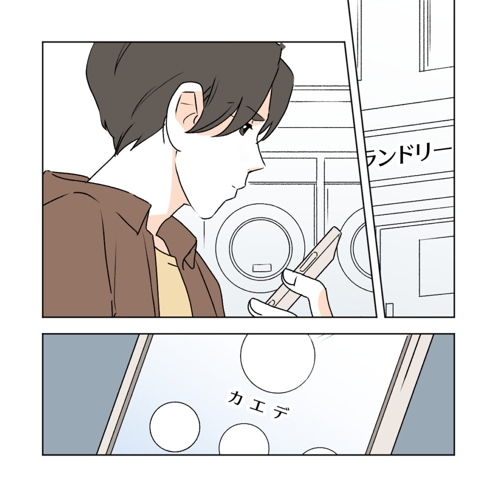 とりあえずの対応策でコインランドリーにひとりで向かったワタルは、交換したばかりのカエデの連絡先をじっと見つめて考えていました。