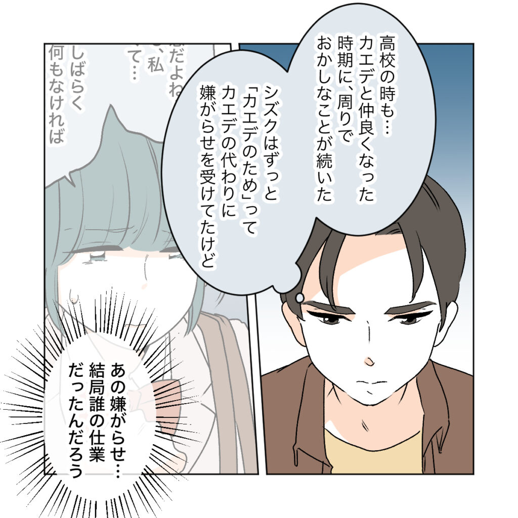 シズクは高校のときも、カエデのためと言って代わりに嫌がらせの手紙が届くようにワタルと一緒にいるようにして付き合っている噂を流したほど、友達であるカエデのことを思っていた。