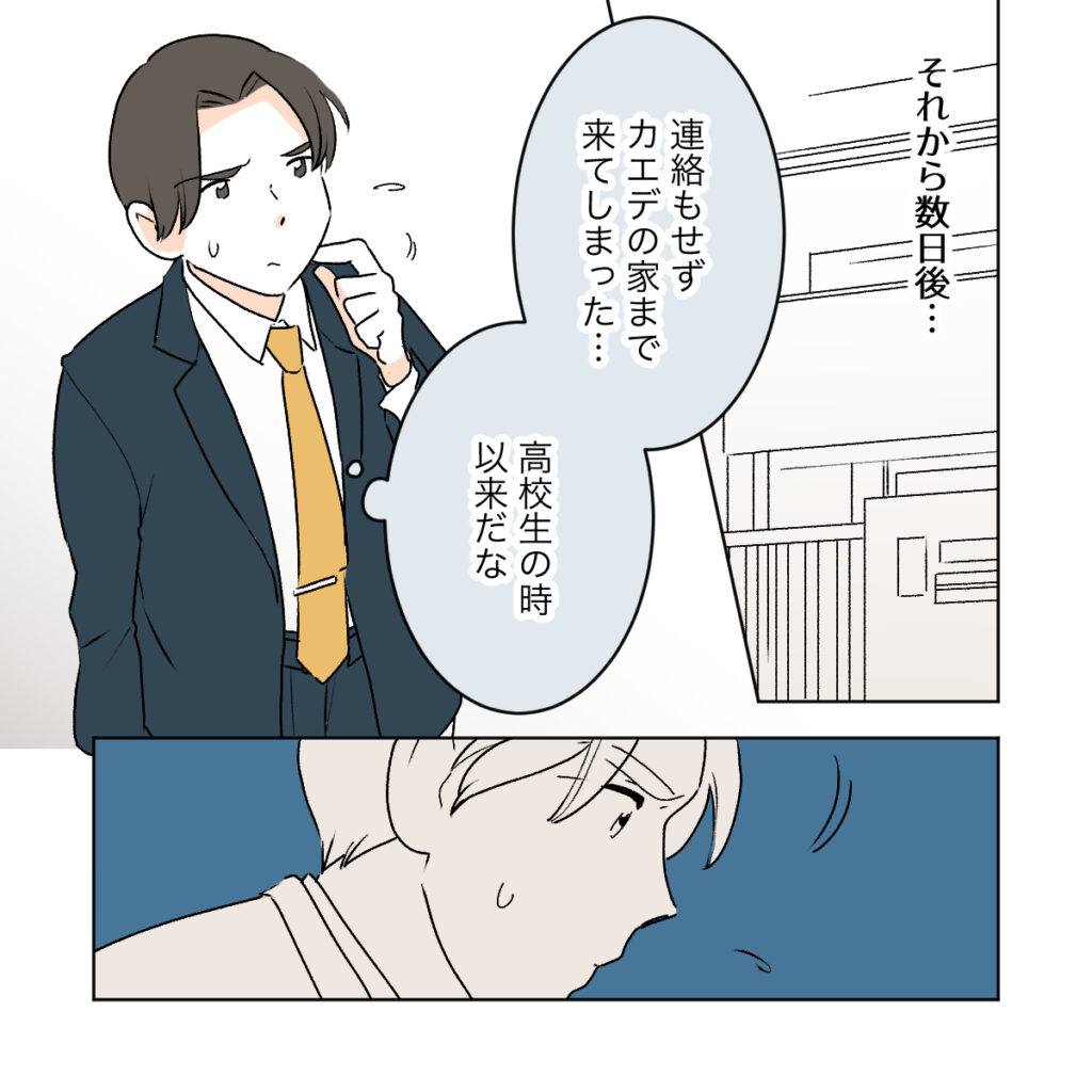 娘ミズキの誕生日会の後、洗面所に置いてあった観葉植物の土が洗濯機の中にばらまかれてしまっていた事件。ワタルはちょうど洗面所から出てきたカエデと会っていたので、まさかとは思いつつもモヤモヤとしていました。シズクは高校のときもカエデの代わりに嫌がらせの手紙を受けるようにわざといつもワタルと一緒にいて付き合っているという噂を流そうと提案したし、カエデと再会してからも嬉しそうなのに、なぜ?とワタルは妻のことを本気で信じていました。シズクのためにもカエデに直接聞いてみた方がいいか悩み、数日後、とうとうカエデの家の前まで来てしまいました。連絡もせず来てしまい、躊躇してまた考え込んでしまったワタル。