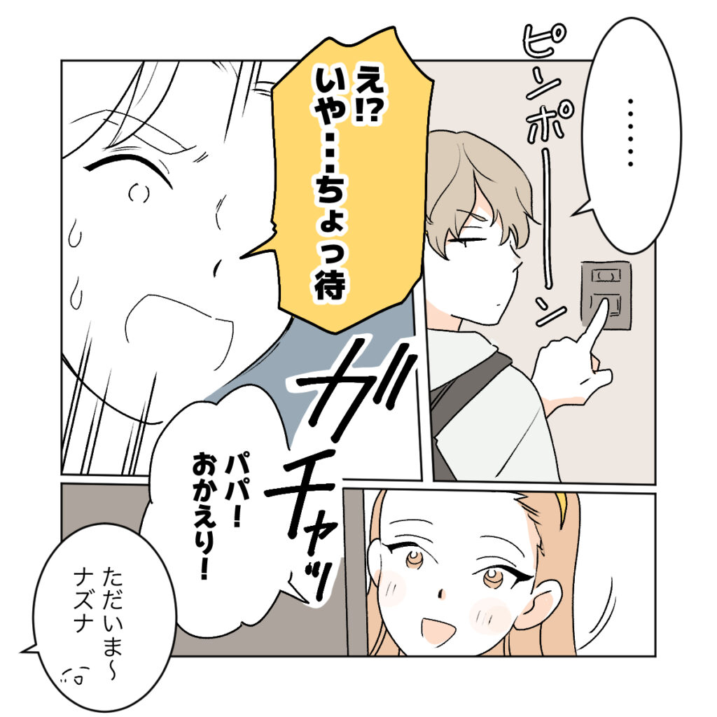 ショウマは無言でカエデの家のインターホンを鳴らしました。少し前までそうしようかとずっと悩んでいたことをショウマがサラリとやってのけて慌てるワタル。「え!?いや、ちょっと待っ・・・」言いかけたタイミングで、可愛らしい女の子が「パパ!おかえり!」と顔を出しました。その瞬間「ただいま~ナズナ」と、クールなショウマの顔がゆるみました。