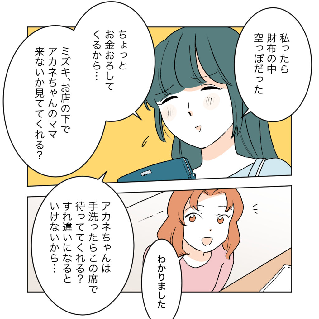 お財布の仲が空っぽだったと言ってお金をおろしに外に出たシズク。お店から出たばかりなのにカエデにすれ違うことなくカエデがお店に着いたこと、挨拶もなくそのまま帰ってしまうところなど違和感ばかりで全部シズクの嘘だと疑いますが、アカネちゃんにとっては信じ切っている友達のママを疑うはずはなさそうですよね。今頃カエデさんはどうしているのでしょう。ひとりぼっちのアカネちゃんが心配です。