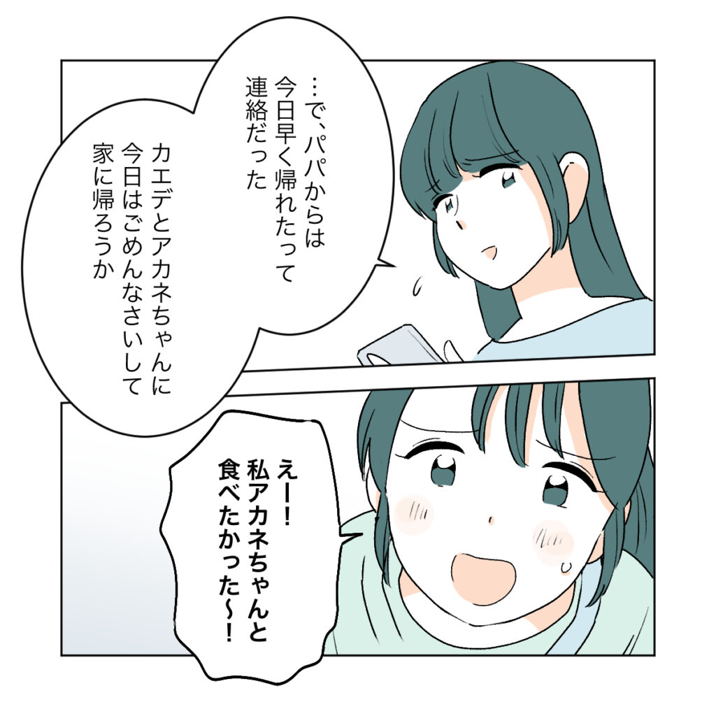さらに「で、パパからは今日早く帰れたって連絡だった。カエデとアカネちゃんに今日はごめんなさいして家に帰ろうか。」と困ったようにミズキに言いました。もちろんミズキは「えー!私、アカネちゃんと食べたかった~!」と言いました。