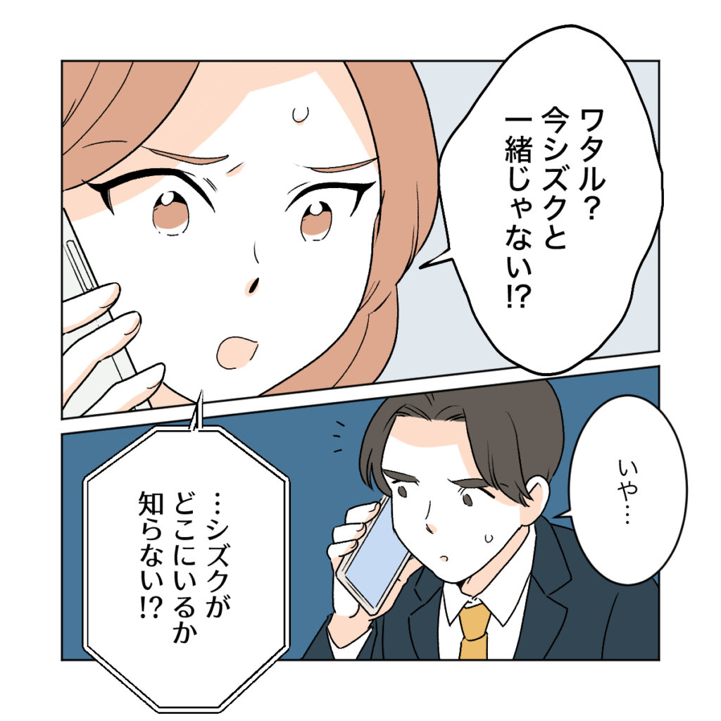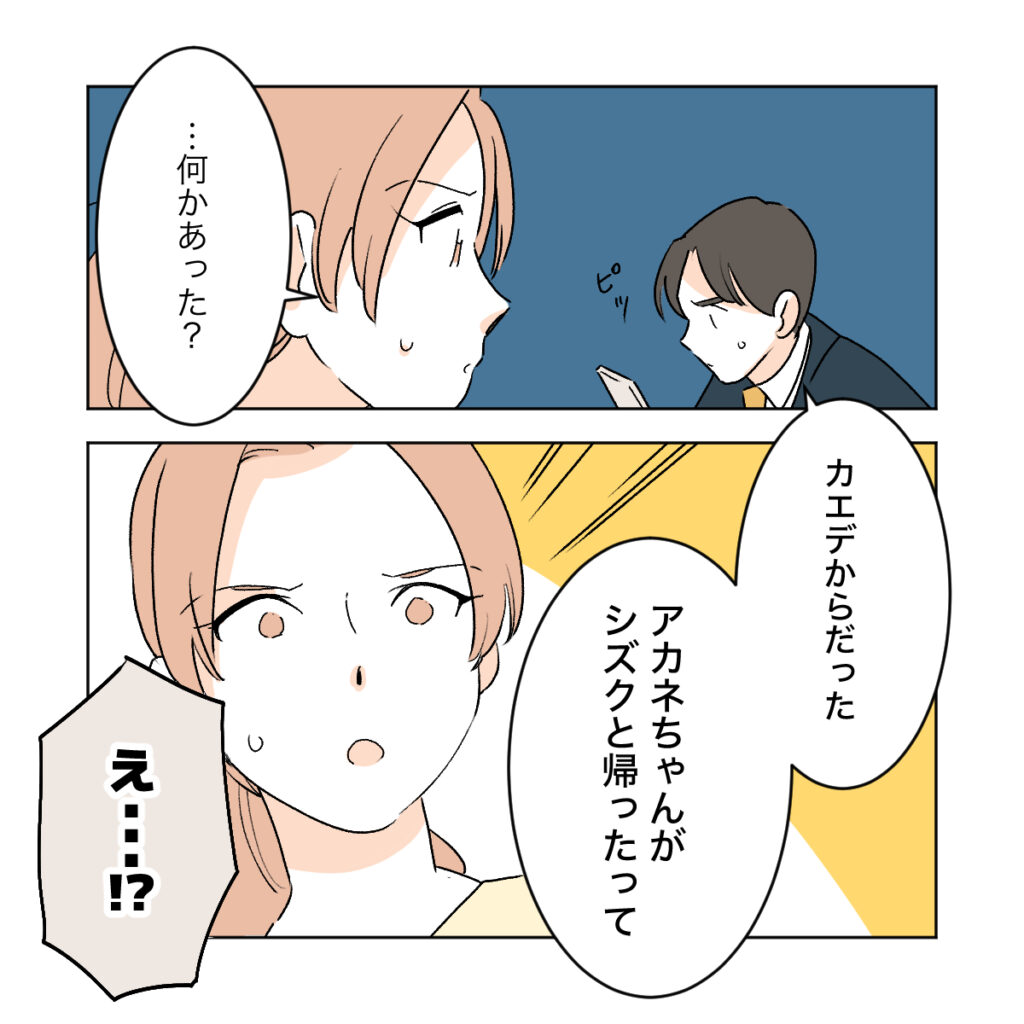 「シズクと一緒ならそんなに慌てなくても・・・」妻を信じるワタルとしては、娘の友達であるアカネちゃんがシズクと一緒なら安心のはずなのに、なぜカエデがここまで慌てるのかピンとこないのです。とにかく必死でシズクの居場所を知りたがるカエデにただならぬ空気を感じたワタルは、シズクに連絡することにして一旦カエデからの電話を切りました。