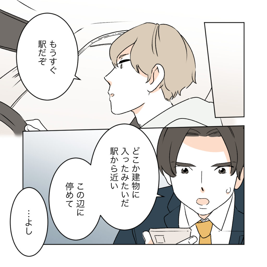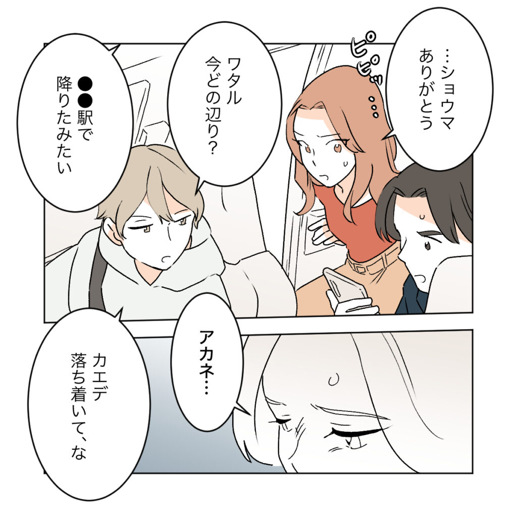 ショウマの運転する車にワタルが乗り込み、すぐにカエデを迎えに走りました。GPSでシズクの居場所を確認しながら急いで追いかけます。娘アカネが心配でたまらない様子のカエデにショウマは優しく声をかけました。