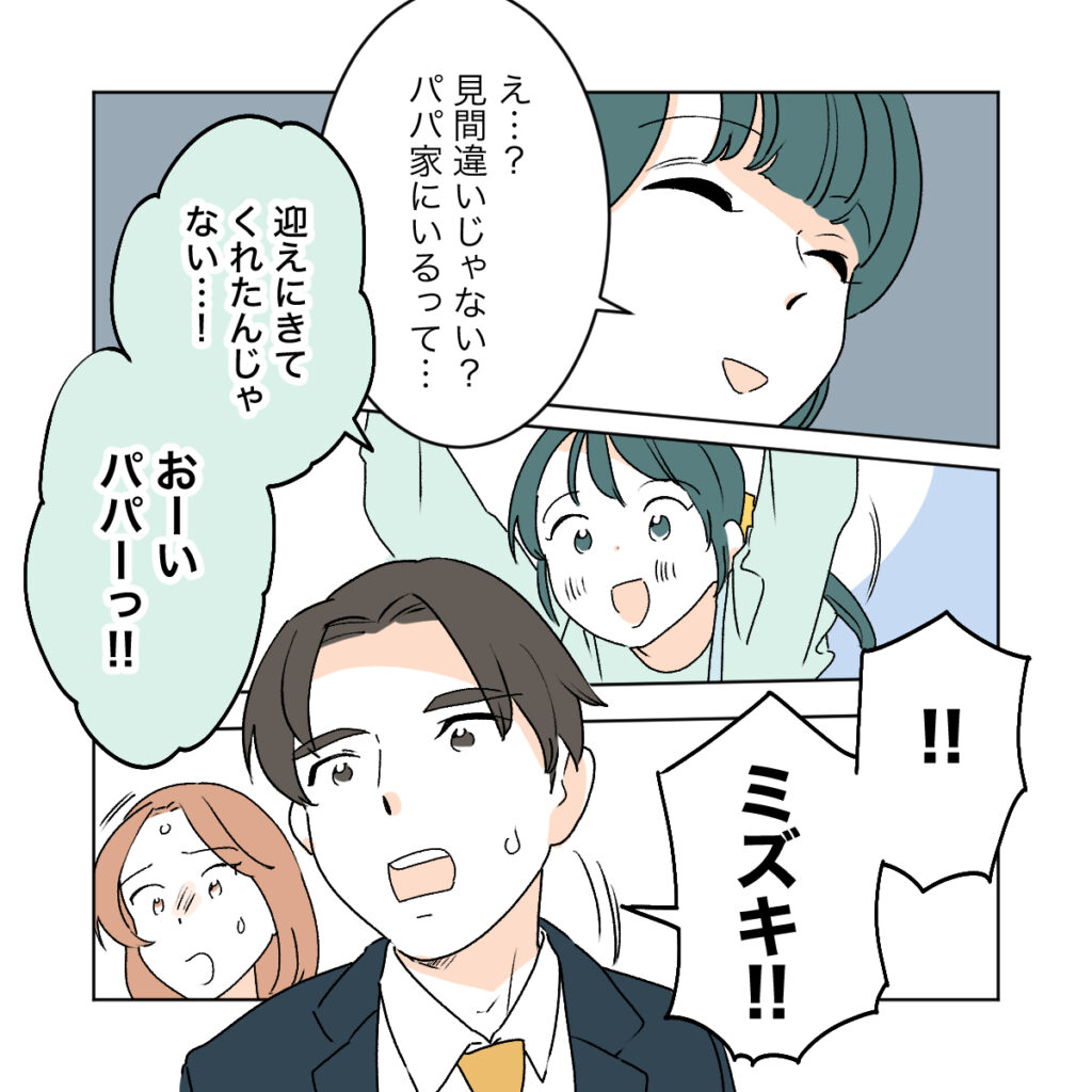 「あれってパパじゃない?」とミズキはすぐにシズクに伝えましたが、シズクはミズキの指す方を探そうともせず「見間違いじゃない?」と笑顔で言いました。パパは家にいる・・・と言いかけたママの言葉を遮って、ミズキはパパの姿をハッキリ捉えて「迎えに来てくれたんじゃない」と嬉しそうに言いました。そして「おーいパパーっ!」と呼ぶ娘の声で、ワタルたちもシズクとミズキの姿を見つけました。