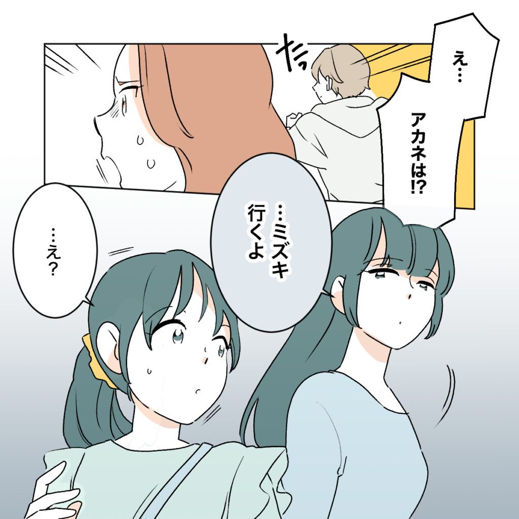 急いで自分たちの方へ駆け寄ろうとしているワタル、そして「アカネは!?」と焦っているカエデの姿も見えているにもかかわらず、シズクに「ミズキ、行くよ」と言われて驚いたミズキが振り返ると、そこには笑顔が消えた、いつもと違うママの顔がありました。