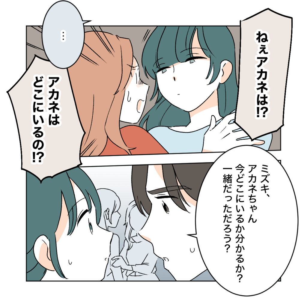 大人たちが必死で走ってきて、ママは無表情で立ち去ろうとして、状況がよく分からず動揺するミズキ。そこへカエデがようやく追いつきました。「シズク・・・!アカネは!?」とひどく動揺しています。