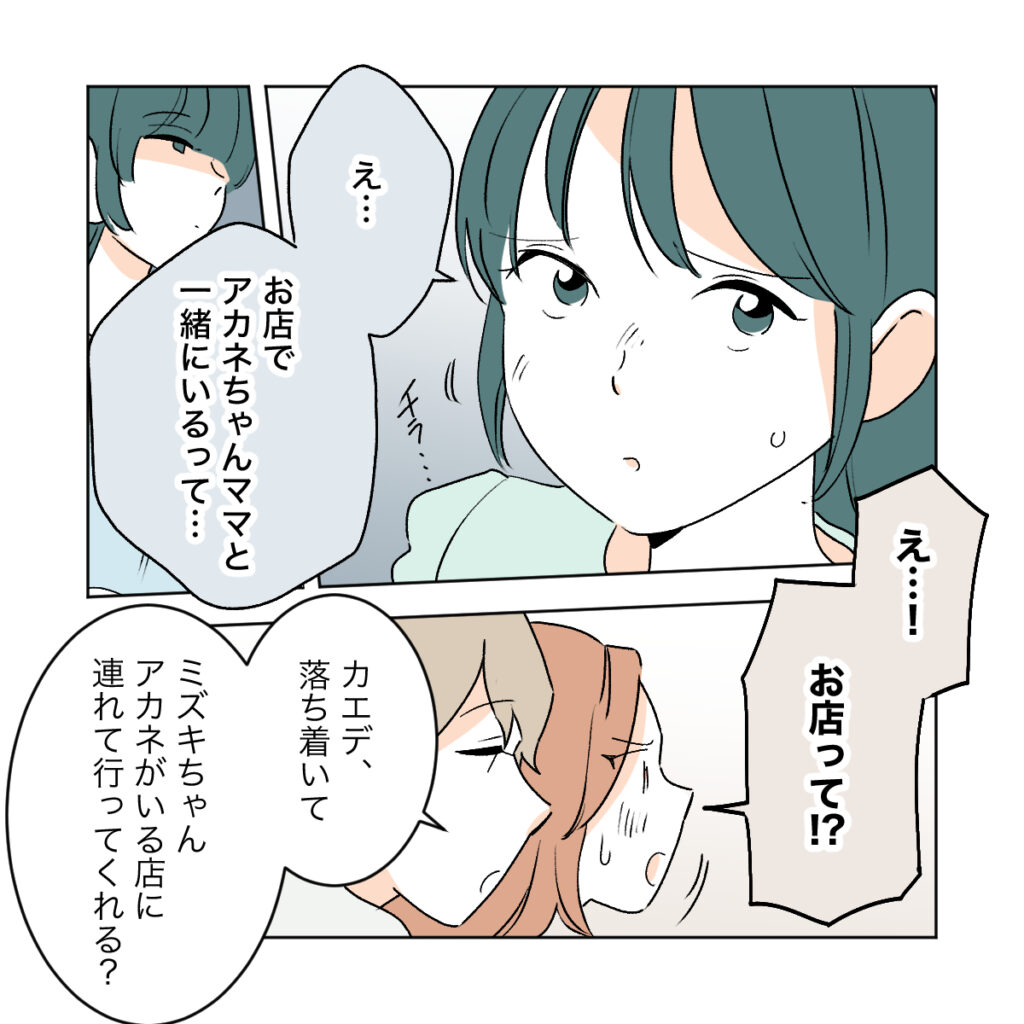 ミズキは、ママが本当のことを言っていなかったと理解したのか、「お店でアカネちゃんママと一緒にいるって・・・」と言いながらチラリと心配そうにシズクを見上げました。動揺するカエデを落ち着かせながら、ショウマが「ミズキちゃん、アカネがいる店に連れて行ってくれる?」と何でもない雰囲気を装いながら言いました。