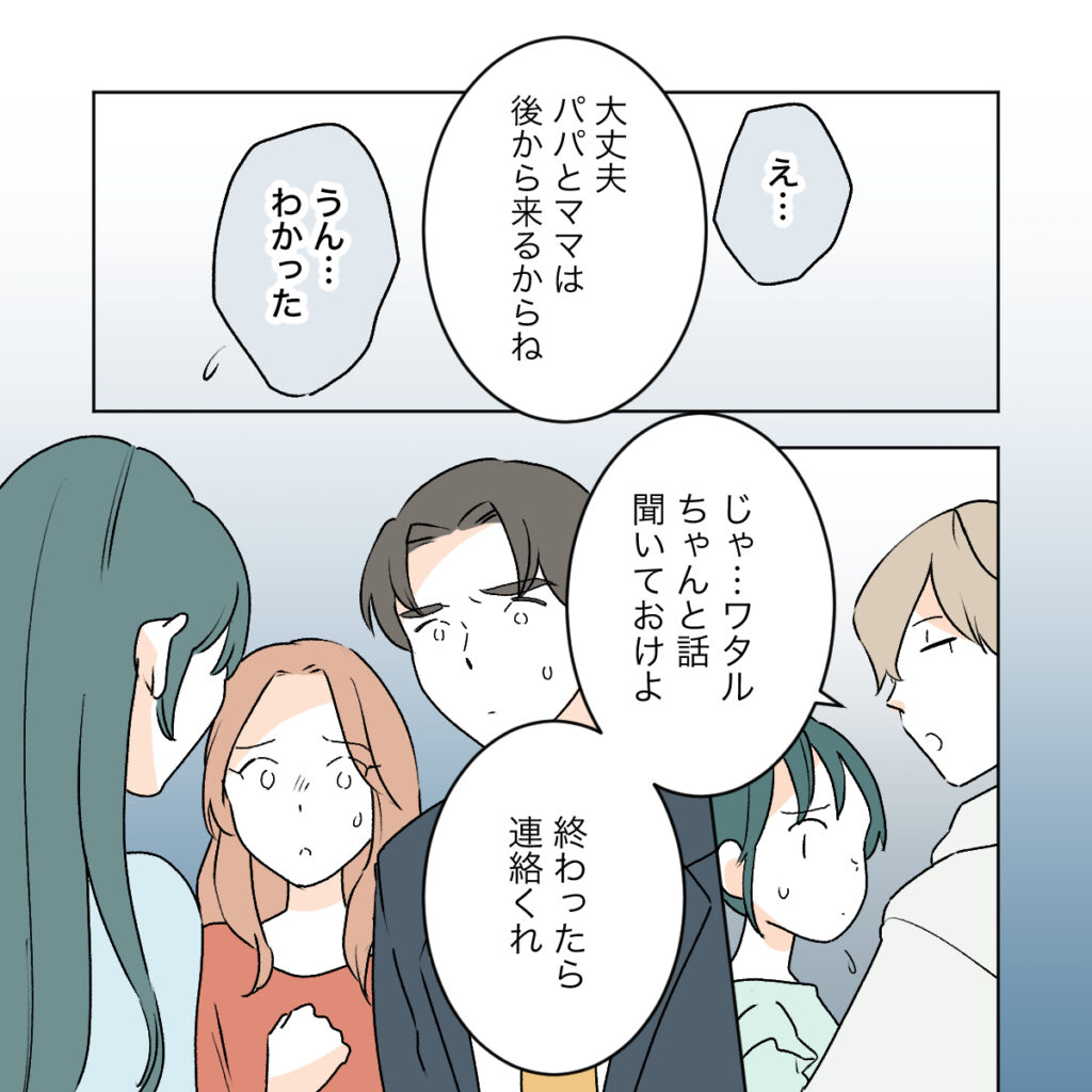 「大丈夫、パパとママは後から来るからね」と言うと、ミズキだけを連れて「じゃ、ワタル、ちゃんと話聞いておけよ。終わったら連絡くれ。」と言い残してアカネを迎えに行きました。