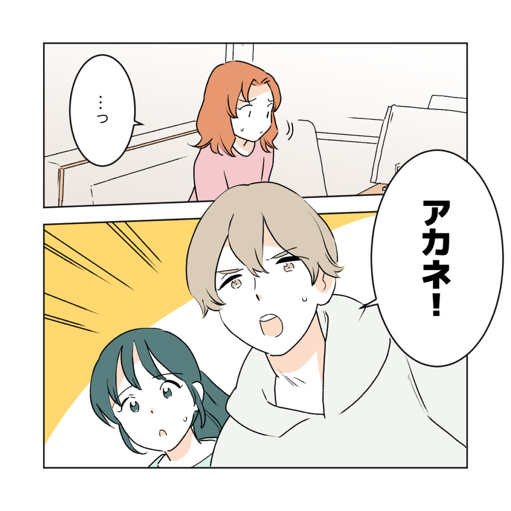 高校の同級生だったワタルとシズク夫妻。久しぶりに地元に戻ったカエデ。そして、カエデの妹サクラと高校時代から付き合っていて、今は夫になったショウマ。当時お互いに好きだけれど思いを伝えられないまま、ワタルはシズクと、カエデはショウマと付き合い始めてしまったと勘違いしてお互いを諦めた背景には、シズクの策略があったのだとショウマとサクラはずっと疑っていました。カエデもまさかシズクが、と思いながらもやはり疑いを拭い去ることはできませんでしたが、シズクの娘ミズキとカエデの娘アカネが同じクラスで仲が良いことで関係を断ちきれずにいました。ある日、カエデに何の連絡もなしに、ミズキと同じ習い事に通うアカネを連れ出したシズクは、ミズキとアカネに噓をつき、アカネをレストランに残して帰ってしまいます。アカネはシズクと一緒にいる可能性が高いと思ったカエデ、ショウマ、ワタルの3人は、ミズキのGPSを頼りにシズクの居場所を突き止めます。カエデたちに追いつかれまいとミズキと一緒にその場を去ろうとするシズクですが、先回りしたショウマに行く手を阻まれます。カエデは「アカネはどこにいるの!?」とひどく動揺した様子でシズクに迫りますが、全く口を開こうとしません。埒が明かないと思ったワタルは、ミズキにアカネが今どこにいるか聞くと、「お店でアカネちゃんママと一緒にいるって・・・」とシズクを見ながら心配そうに言いました。ショウマは動揺するカエデを落ち着かせながら、自分がアカネを迎えに行くから終わったら連絡してと言い、ミズキと共にその場から離れていきました。いよいよワタル、シズク、カエデが3人で直接話すときがきたようです。