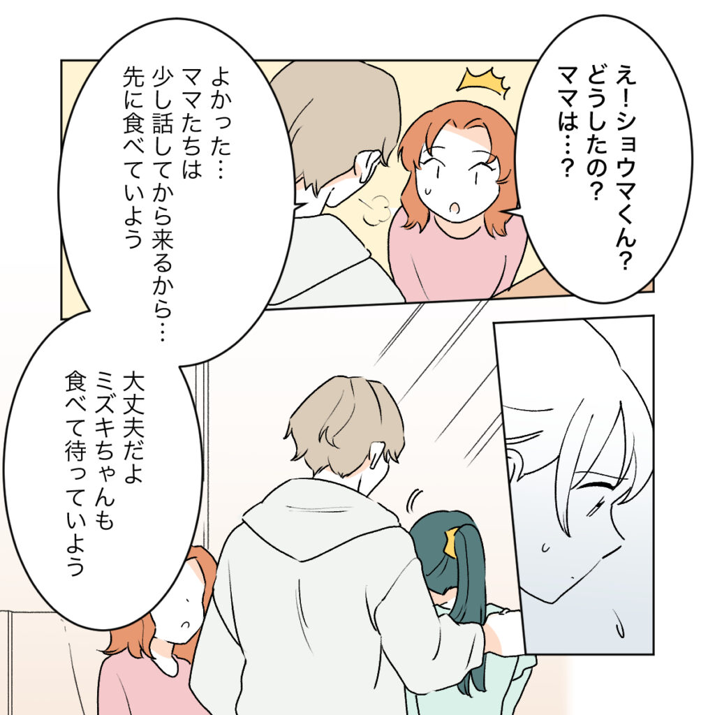 意外すぎる人物の登場に驚くアカネ。ショウマは平静を装って「ママたちは少し話してから来るから・・・先に食べていよう」と言いました。