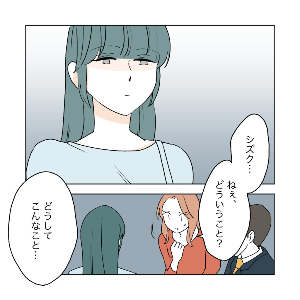 電話を切ると、カエデはシズクに「シズク・・・ねぇどういうこと?どうしてこんなこと」と問いかけます。カエデには、なぜシズクが自分の周りにいる人に危害を加えようとするのかが理解できませんでした。しかし、シズクは何も言わず、無表情のまま一点を見つめています。