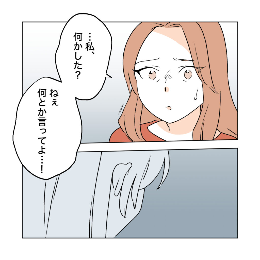 普段の姿からは想像もできないほど、氷のように冷たい態度のシズク。カエデは困惑した表情で、「・・・私、何かした?ねぇ何とか言ってよ・・・!」と問いかけました。