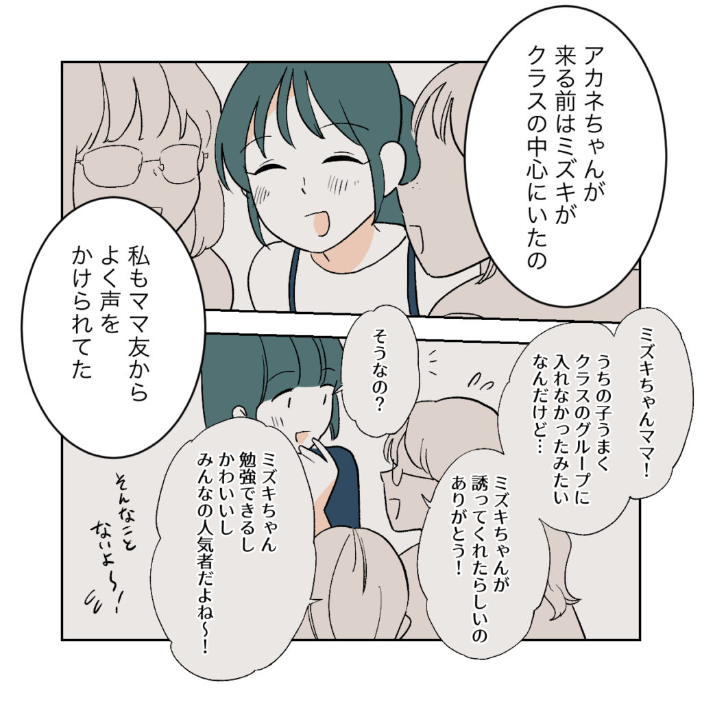 アカネが転校してくるまでは、ミズキがクラスの中心にいました。ミズキには、自分のように惨めな思いをしてほしくない・・・その一心で、勉強ができて人当たりもよい、誰にでも好かれる子になるように育ててきました。その甲斐もあり、ミズキはみんなの人気者になりました。