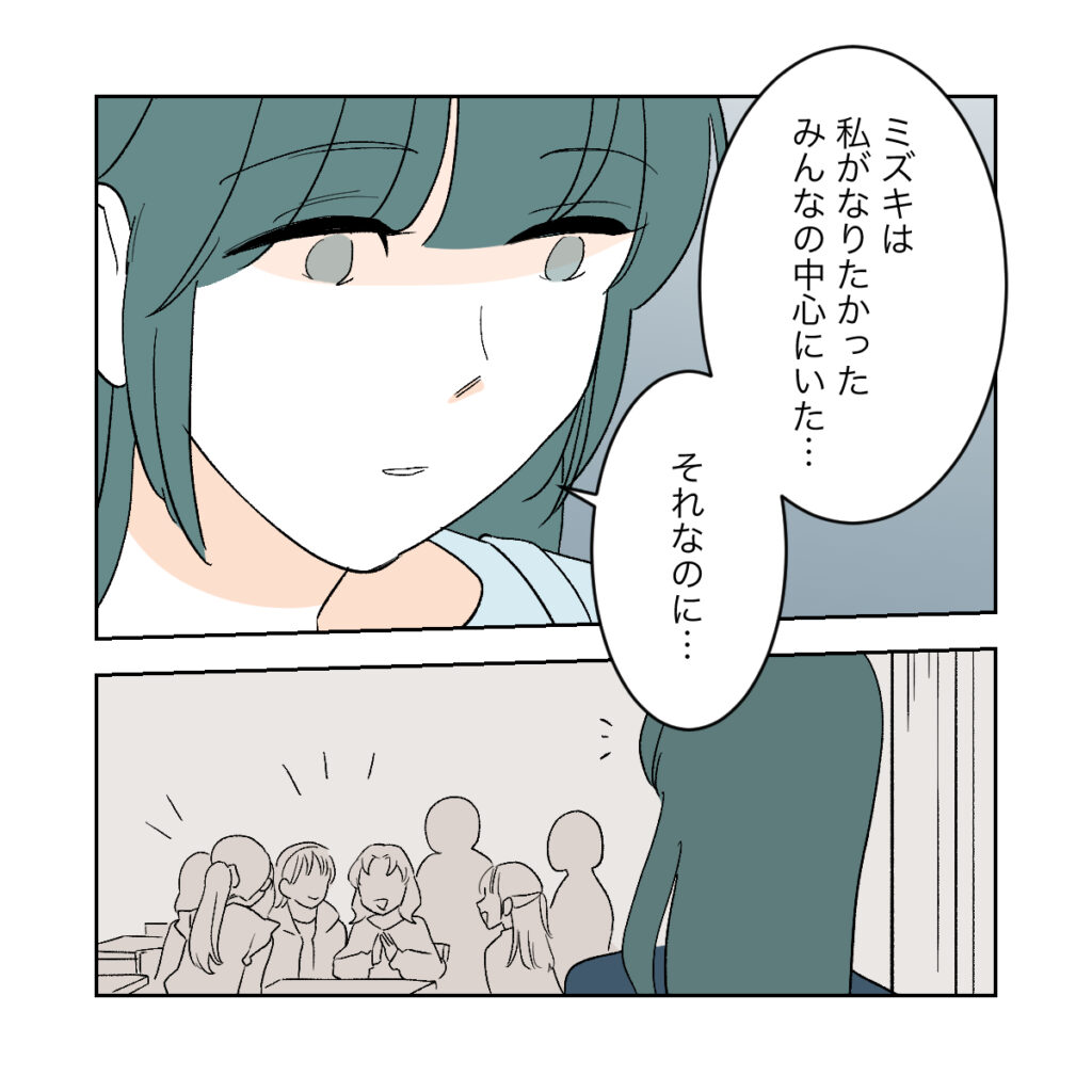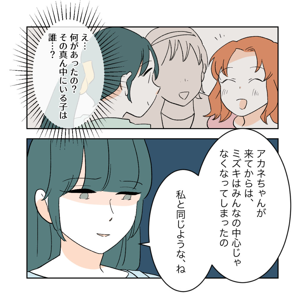「ミズキは私がなりたかったみんなの中心にいた・・・それなのに・・・」シズクは暗い表情でぽつりとつぶやきます。自分がいられなかったポジションに娘がいて、みんなの真ん中で楽しそうに笑っている、それだけで優越感に浸れていた。しかし、大事に築き上げてきたポジションは、アカネの登場によっていとも簡単に崩れ去ってしまったのです。