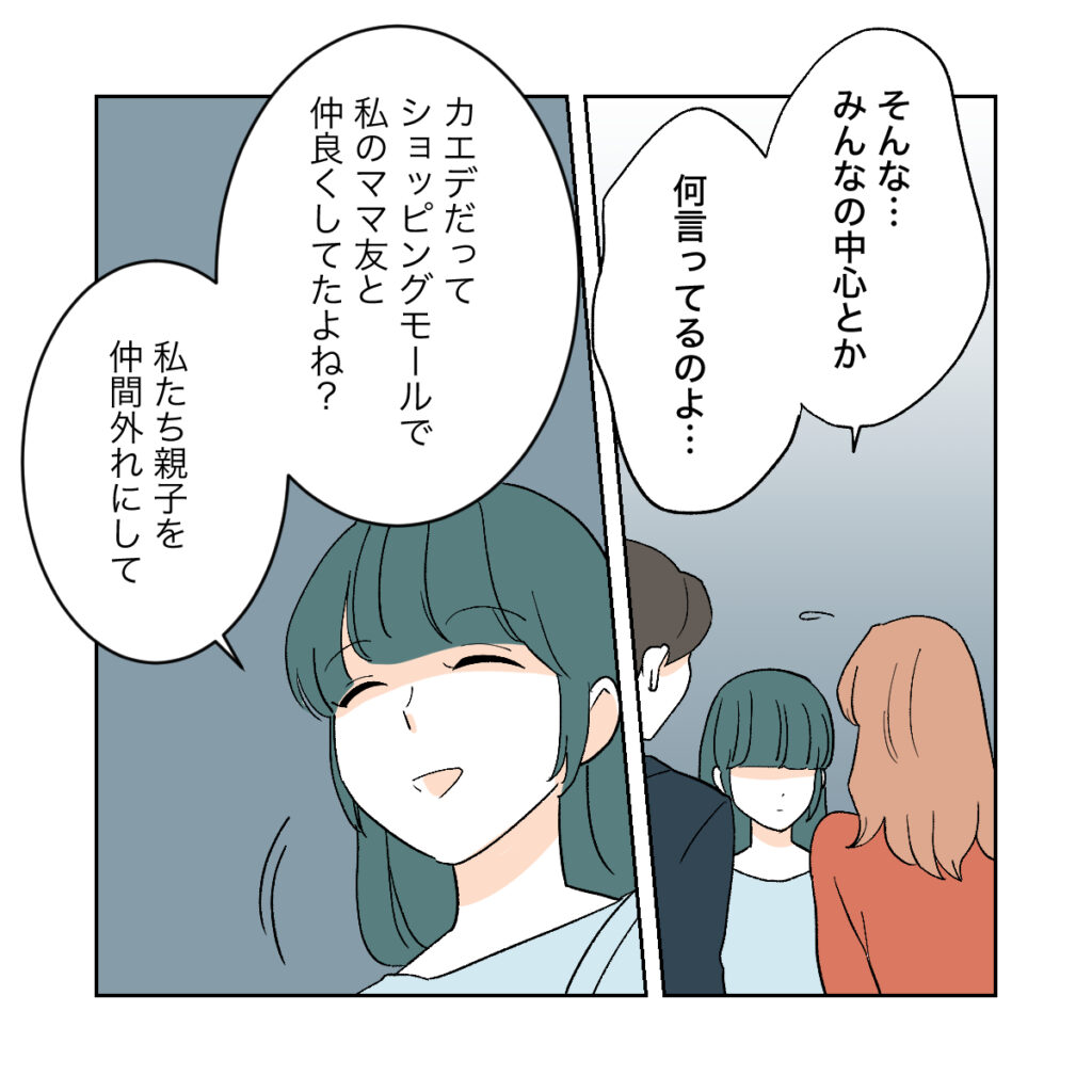 みんなの中心でいることに執着するシズクに、カエデは「みんなの中心とか、何言ってるのよ・・・」と声をかけます。するとシズクは「カエデだってショッピングモールで私のママ友と仲良くしてたよね?私たち親子を仲間外れにして」と言いました。