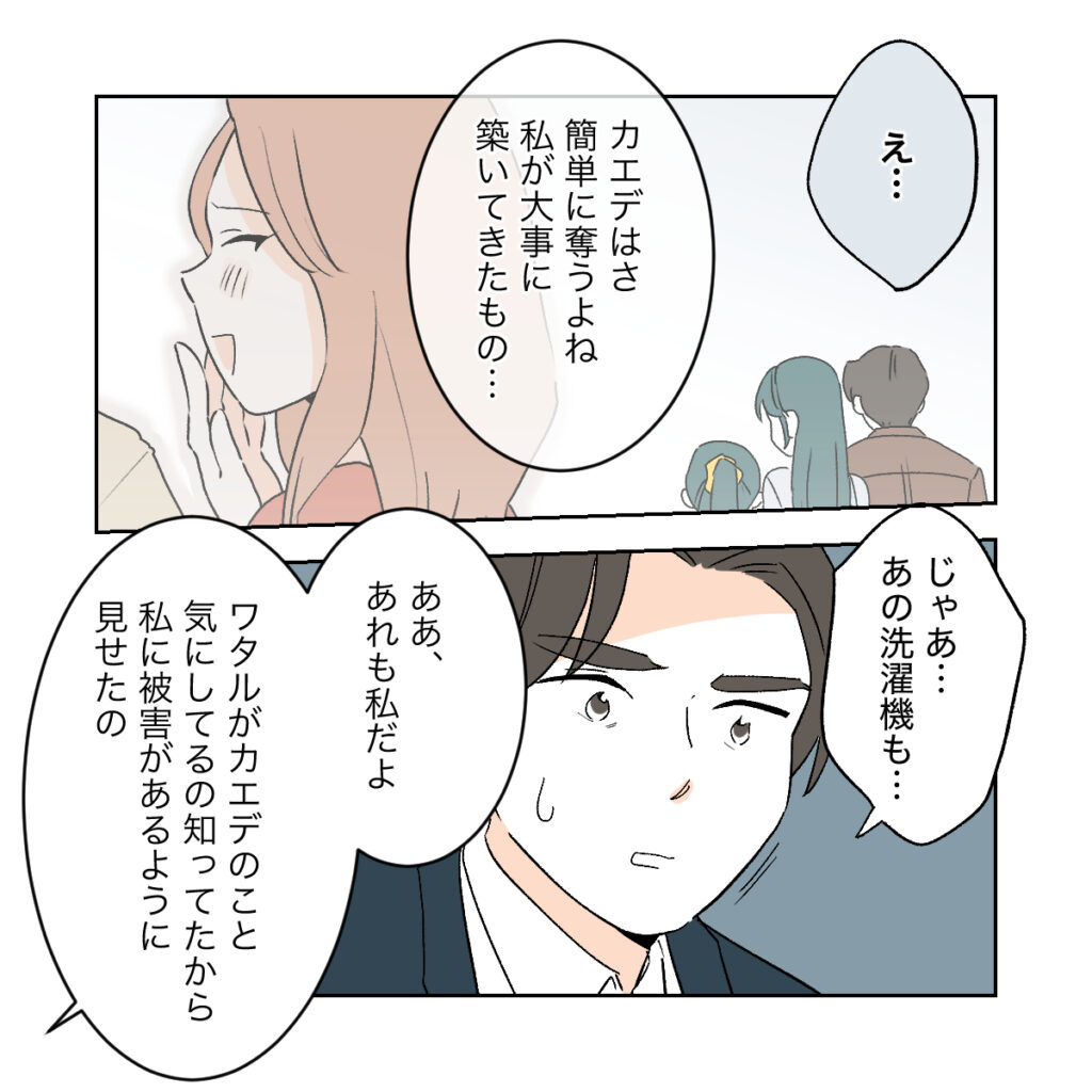 「カエデはさ簡単に奪うよね、私が大事に築いてきたもの」そう言うシズクの表情は、どこか寂しそうに見えました。ワタルはハッとしたように「じゃあ・・・あの洗濯機も」と言うと、「あれも私だよ、ワタルがカエデのこと気にしてるの知ってたから私に被害があるように見せたの」と答えました。