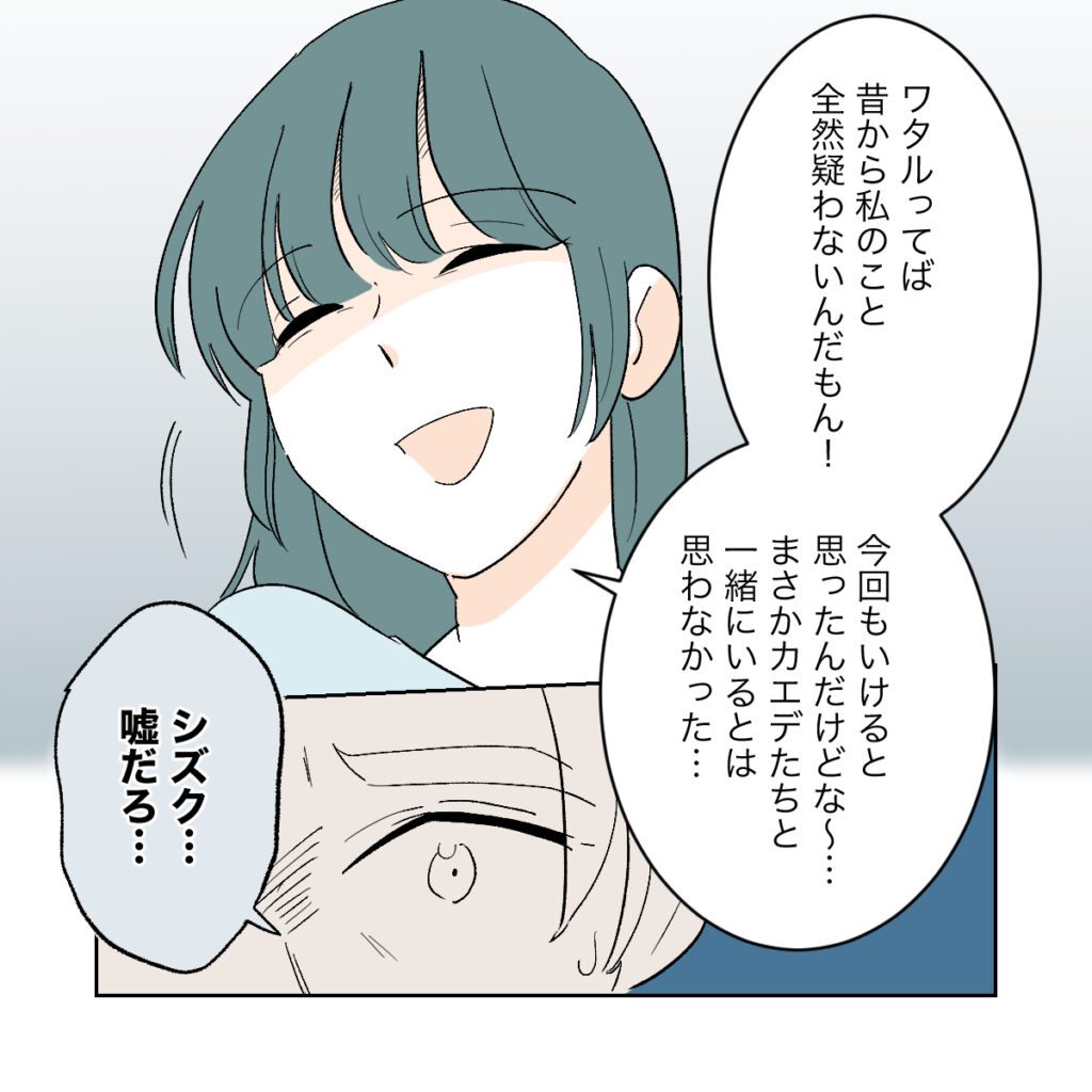 「ワタルってば昔から私のこと全然疑わないんだもん!今回もいけると思ったんだけどな~」笑いながら話すシズクを見て、顔を青ざめるワタル。高校の時に変な手紙が届いたって相談してきたのも、洗濯機へのいたずらをカエデの仕業に仕立て上げたのも、全部シズクの自作自演だったと知り、ショックをうけます。