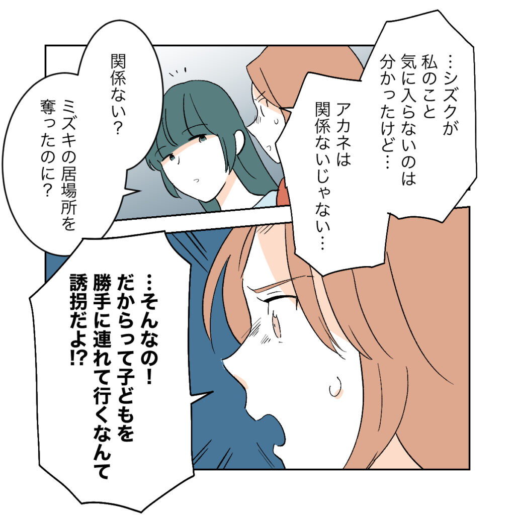 カエデが「私のこと気に入らないのは分かったけど、アカネは関係ないじゃない」と言うと、シズクは「関係ない?ミズキの居場所を奪ったのに?」とぼけるように言いました。シズクの態度に我慢できなくなったカエデは、「だからって子どもを勝手に連れて行くなんて誘拐だよ!?」と声を荒げました。するとシズクは、必死に訴えかけるカエデを嘲笑うかのような表情で「誘拐?一緒にご飯を食べようと思っただけだよ?」と悪びれもなく言いました。