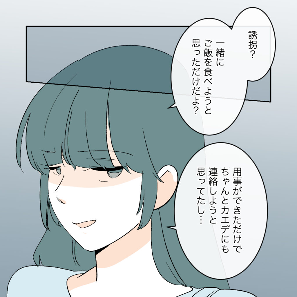 するとシズクは、必死に訴えかけるカエデを嘲笑うかのように「誘拐?一緒にご飯を食べようと思っただけだよ?用事ができただけでちゃんとカエデにも連絡しようと思ってたし・・・」と言いました。