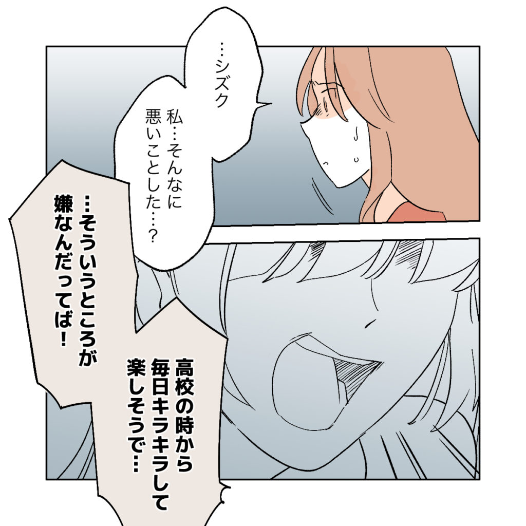 シズクにここまで敵意を向けられる理由が分からなかったカエデは、「シズク、私そんなに悪いことした?」と聞きます。するとシズクは「そういうところが嫌なんだってば!高校の時から毎日キラキラして楽しそうで・・・」と声を荒げました。