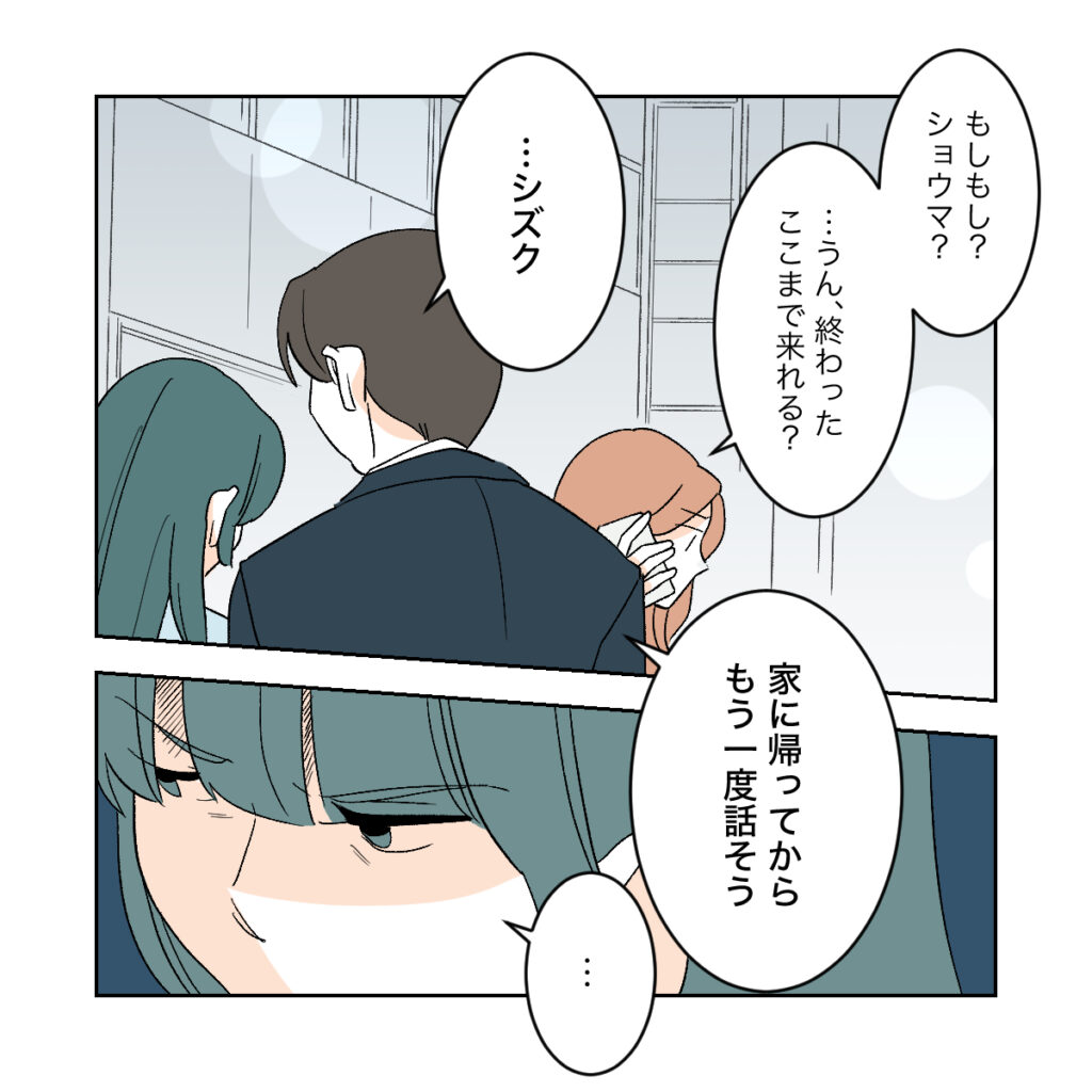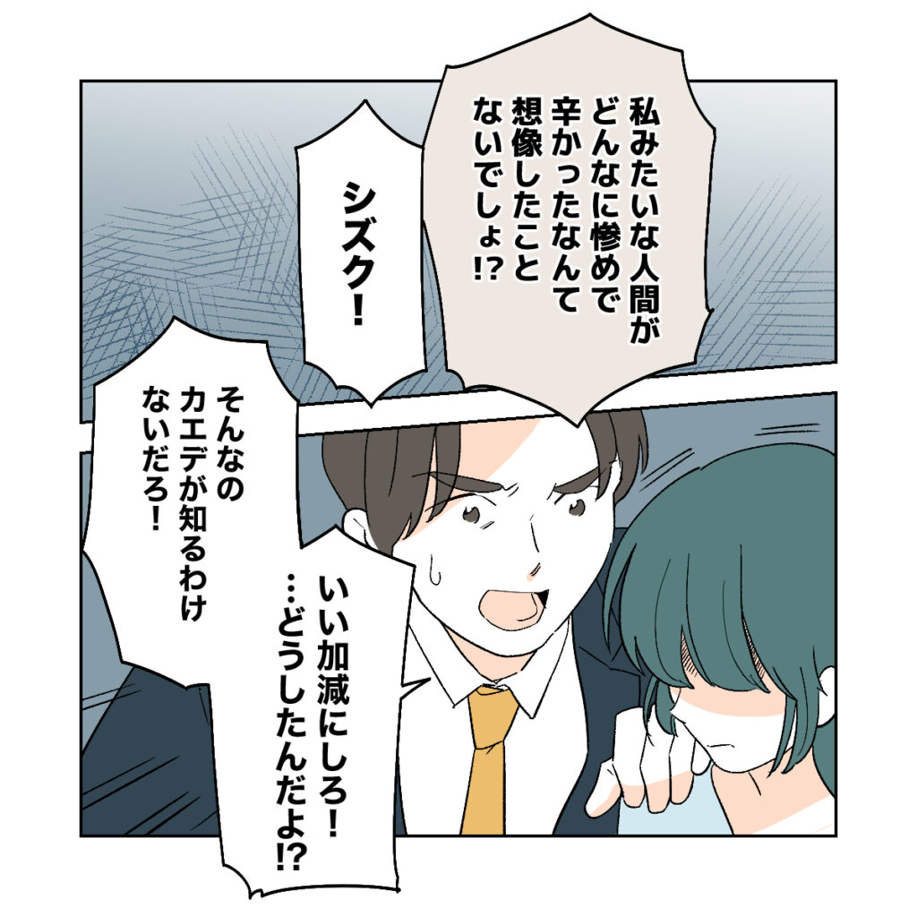 シズクにここまでの敵意を向けられる理由が分からなかったカエデは、「私そんなに悪いことした?」と聞きます。するとシズクは「そういうところが嫌なんだってば!私みたいな人間がどんなに惨めで辛かったなんて想像したことないでしょ!?」と憤慨した様子でカエデをまくし立てました。今は自分もシズクも冷静に話し合える状態じゃないと思ったワタルは、カエデに謝罪すると「シズクのやったこと許してほしいとは言わない、だけど一度夫婦でちゃんと話がしたいんだ、落ち着いてまた話ができないか?」と言いました。ワタルはシズクに、家に帰ってからもう一度話そうと声をかけますが、シズクはそれに応じるどころか一切目も合わせず、自分は悪くないといった表情を浮かべていました。