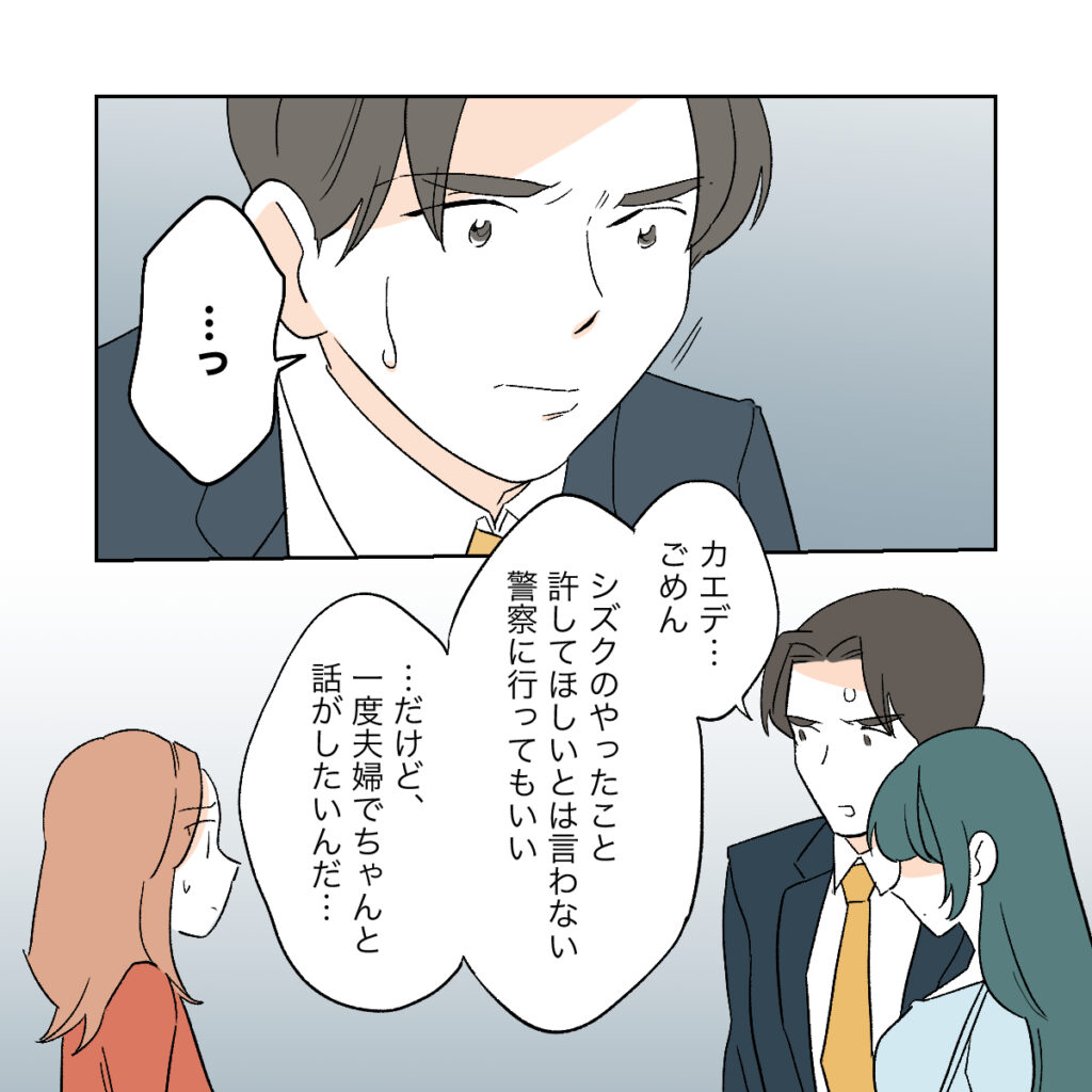 いつもの穏やかな様子からは想像もつかないほど豹変したシズクを見て、戸惑いを隠せないワタル。シズクの代わりにカエデに謝罪すると、「シズクのやったこと許してほしいとは言わない、警察に行ってもいい・・・だけど一度夫婦でちゃんと話がしたいんだ」と言いました。