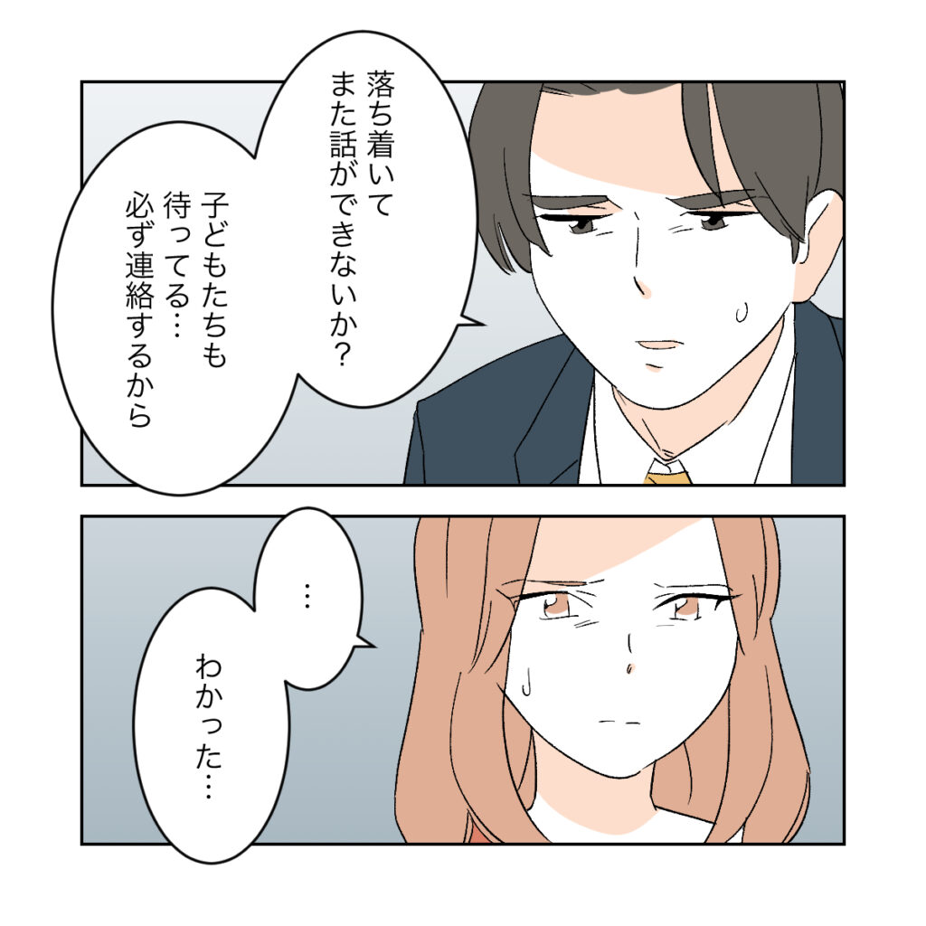 今は自分もシズクも冷静に話し合える状態じゃない、そう思ったワタルは、「落ち着いてまた話ができないか?子どもたちも待ってる・・・必ず連絡するから」とカエデに頼みます。カエデも同じことを思ったのか、「・・・わかった」と言いました。