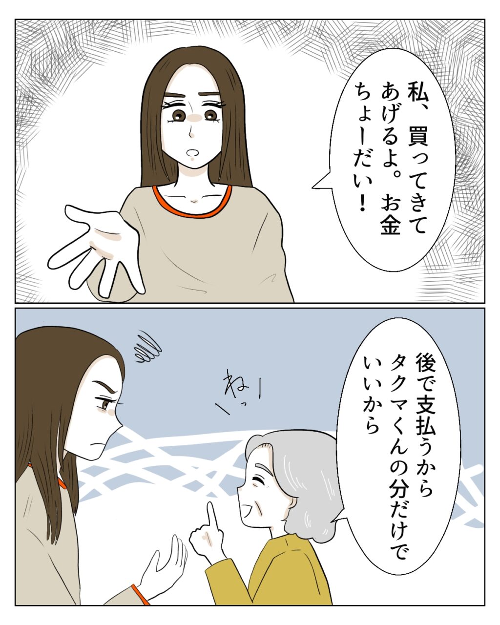 「私が買ってきてあげるよ、お金ちょうだい」私の代わりに、真矢がそう言ってくれました。ところが義母は、真矢にお金を渡すことなく、「後で支払うから、タクマくんの分だけでいいから、ねっ」と、私たちに立て替えを求めてきました。