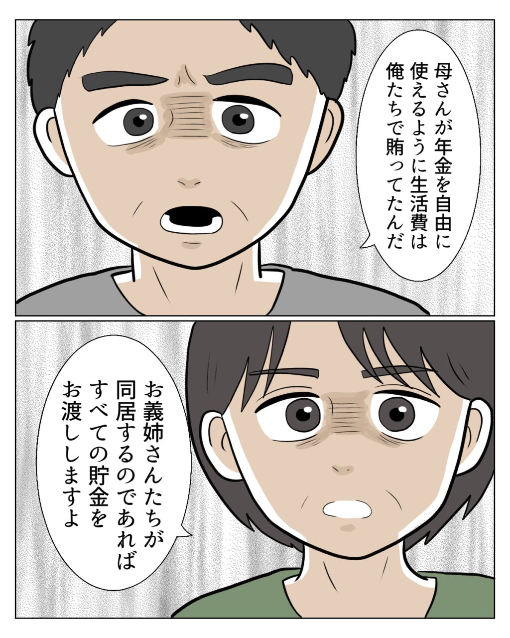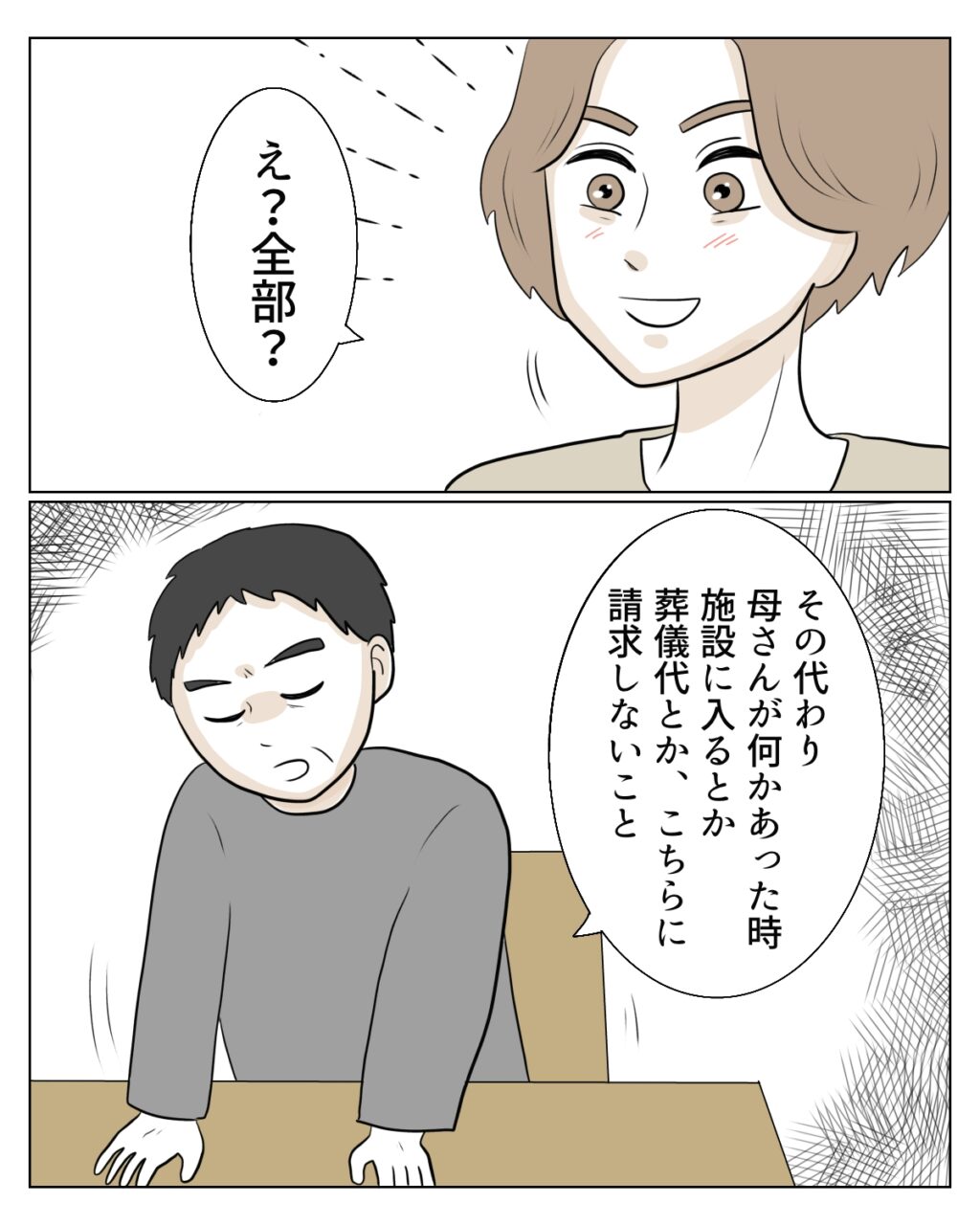 すべての貯金を渡すと聞いたタクマくんは、「え?全部?」と嬉しそうな表情を浮かべます。すると和也さんが畳みかけるように、「その代わり、母さんに何かあった時、施設に入るとか葬儀代とか、こちらに請求しないこと」とため息まじりに伝えます。