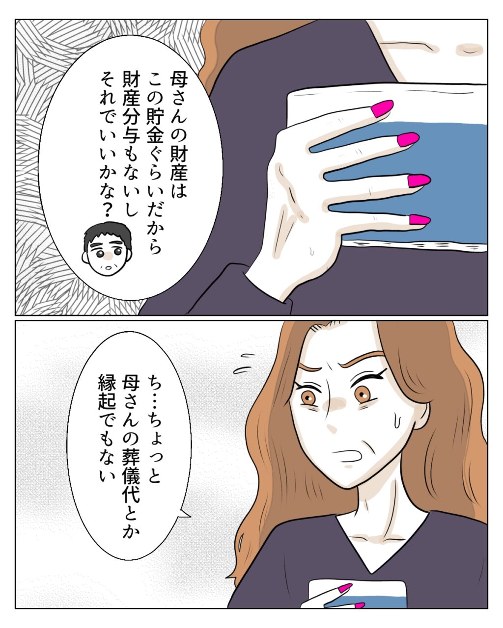 「母さんの財産はこの貯金ぐらいだから財産分与もないし、それでいいかな?」和也さんは義母やエミさんの返事を待つことなく、淡々と同居解消の話を進めていきます。するとエミさんが、「ち、ちょっと母さんの葬儀代とか縁起でもない」と戸惑った表情を浮かべました。