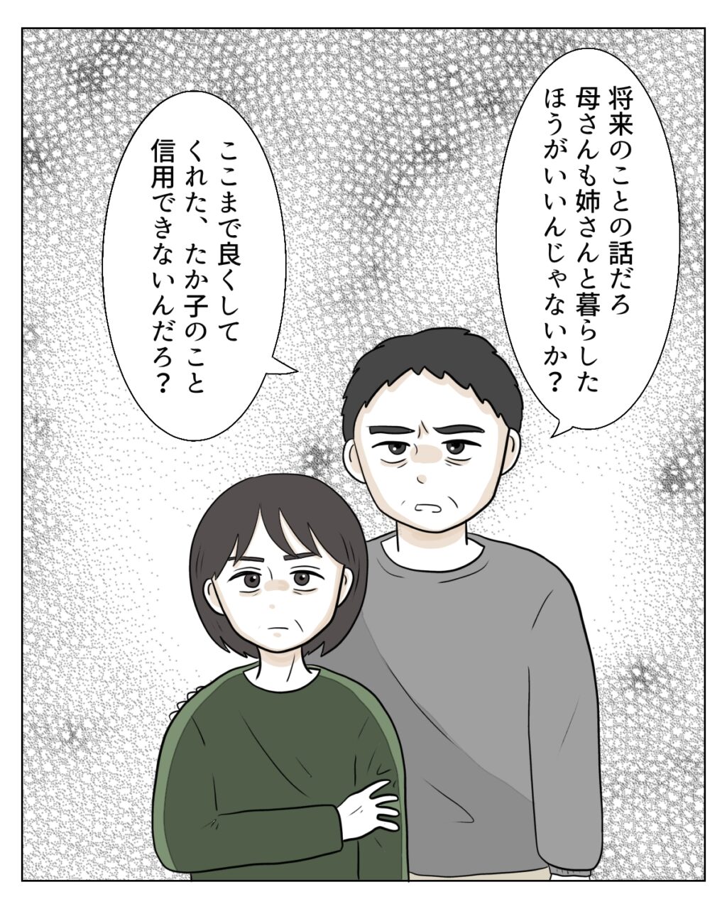 和也さんは、義母とエミさんを鋭い目つきでにらむと「将来のことの話だろ、母さんも姉ちゃんと暮らしたほうがいいんじゃないか?ここまで良くしてくれたたか子のこと信用できないんだろ?」と突き放すように言いました。