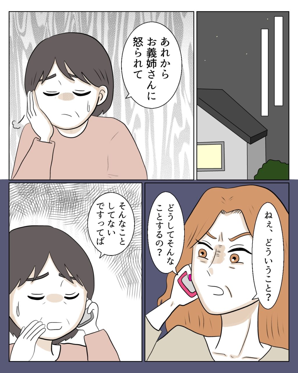 エミさんは物凄い形相で「ねぇ、どういうこと?どうしてそんなことするの?」と私を問い詰めます。「そんなことしてないですってば」と義母への意地悪は誤解だと説明しますが、彼女にはまったく通じませんでした。