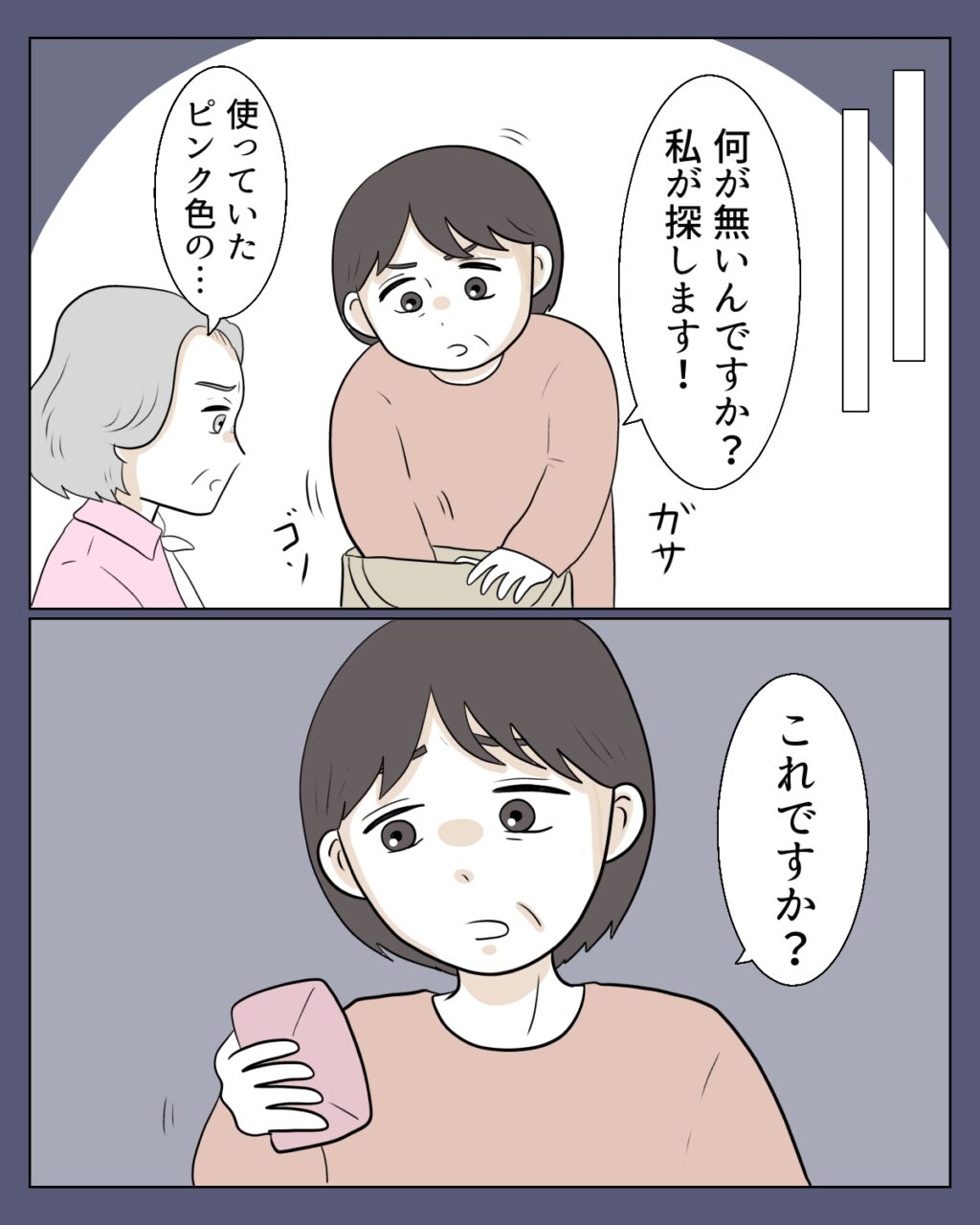 私はそれを手に取り、義母に「これですか?」と問いかけます。すると義母は「あっ・・・」と一言。すぐに謝ってくれればこちらも何も言わないのですが、義母は謝ろうとはしませんでした。私は腹が立ち、思わず「あるじゃないですか?人のせいにしないでください」と言ってしまいました。すると義母は「私も年だから・・・」と泣き出し、いつも通り、私が悪いかのように被害者を装い始めたのです。
