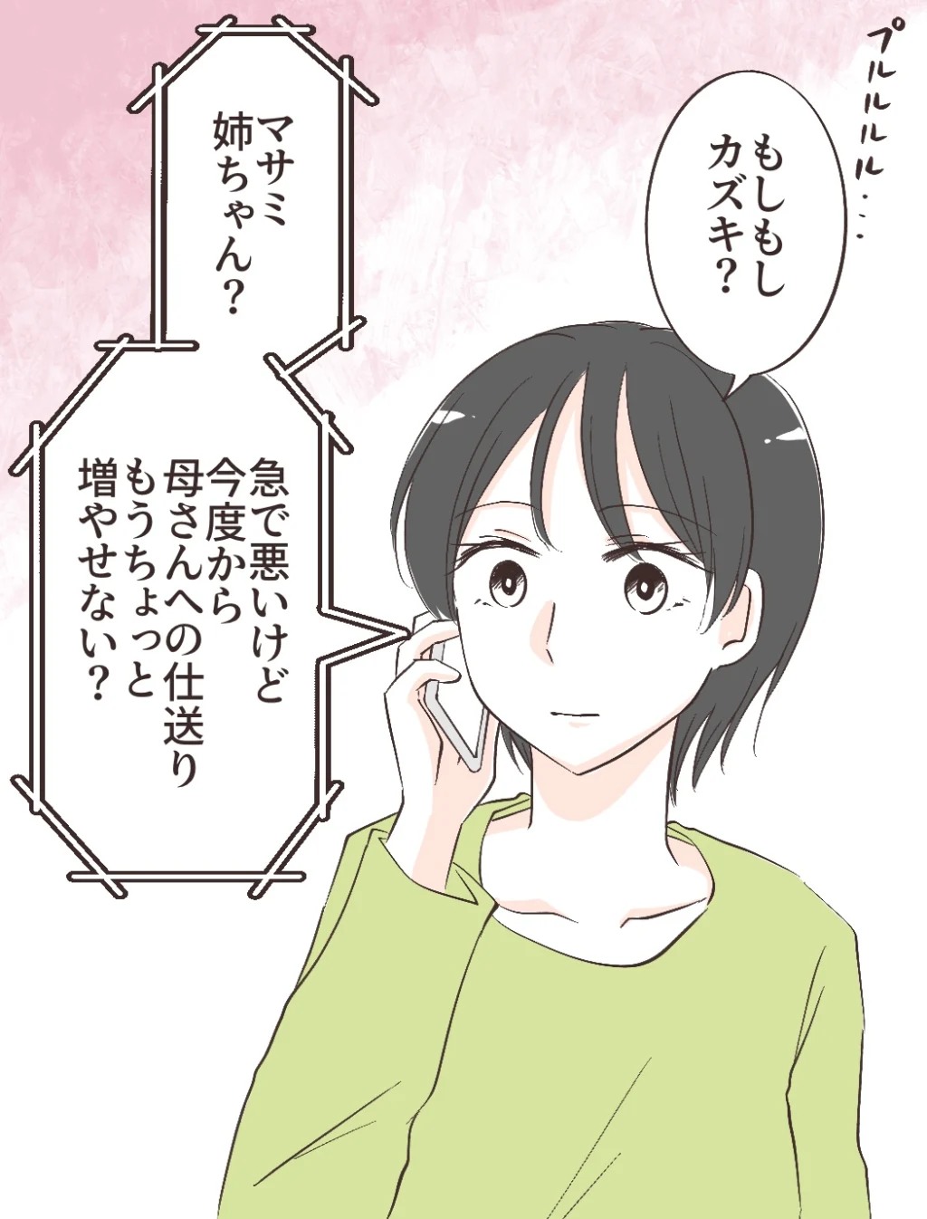 ある日、4つ年下の弟カズキからの電話に出ると、「急で悪いけど」と前置きした後で、実家の母への仕送りを増やしてほしいと唐突に言われました。仕送りなら毎月欠かさずに十分な額を送っているはずなのに・・・母に何かあったのかな、と思いました。
