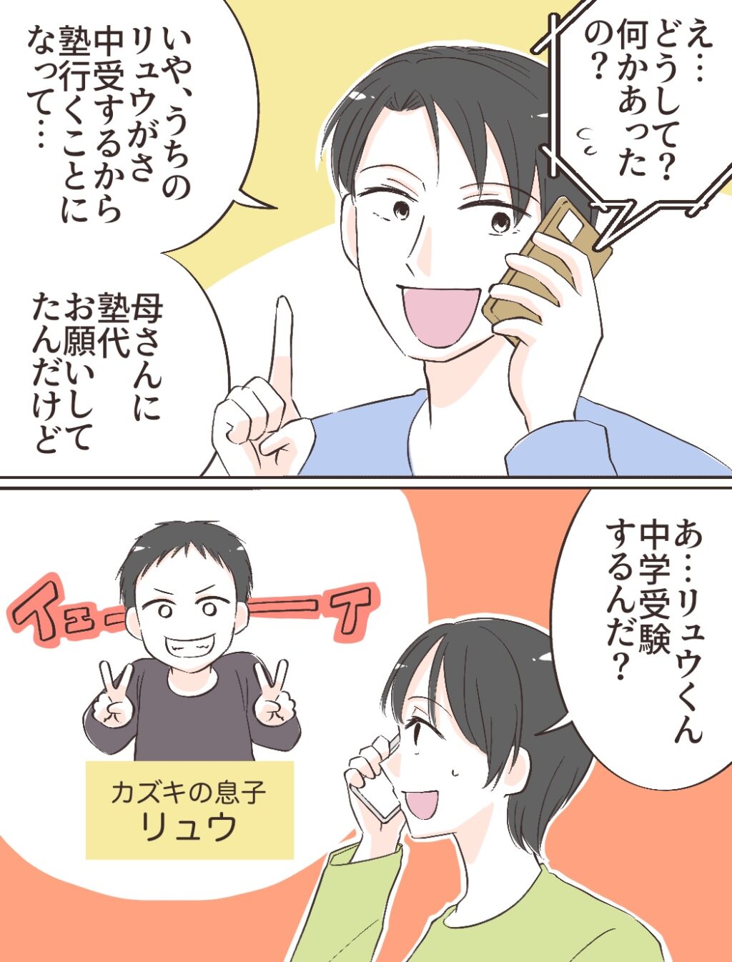 カズキに聞くと、母のことではなく「うちのリュウがさ、中受するから塾行くことになって・・・」と、甥っ子のリュウ君の話を始めました。リュウくん中学受験するんだ、と返事をしつつも、え?だから?と言うのが本音でした。ところがカズキは自分の息子の塾代を母にお願いしていたことを話し出しました。