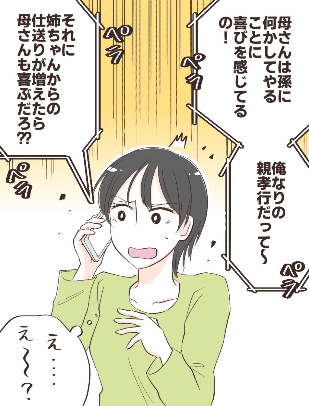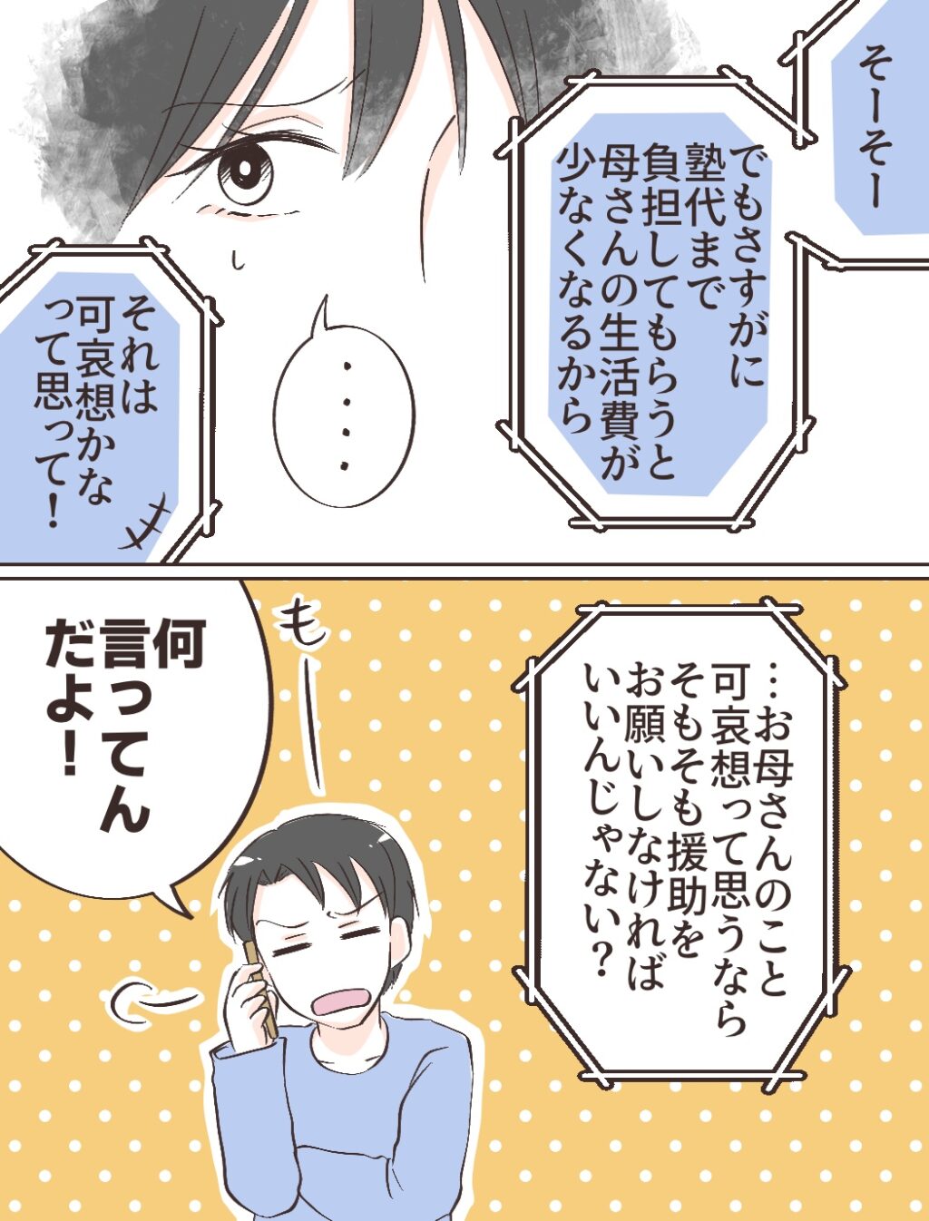 カズキによると、母は孫のリュウくんに何かしてやることに喜びを感じているから、リュウくんの塾代の援助をお願いするのはカズキなりの親孝行なのだそうです。けれどもそれだと母が可哀想だし、私からの仕送り額が増えたら母は喜ぶと言うのです。言っている意味が分からず混乱する私に、カズキはペラペラと身勝手な考えを語るのでした。