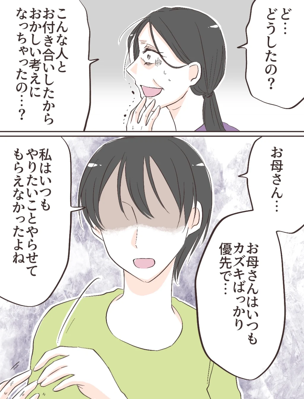 母は、私が言うことを聞かないと分かると焦り始め、「こんな人とお付き合いしたからおかしい考えになっちゃったの?」と震えながら言いました。私は母の手を払うと「お母さん、いつもカズキばっかりが優先で、私はやりたいことやらせてもらえなかったよね」と今まで思っていたことを話しました。