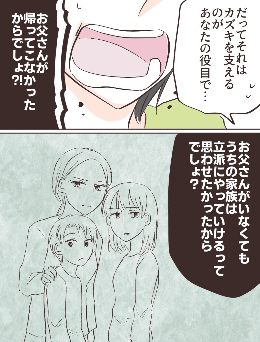 私がそう話しても「だってそれはカズキを支えるのがあなたの役目で・・・」と、この期に及んで私の役目を盾にする母。私は思い切り息を吸い込むと「お父さんが帰ってこなかったからでしょ!?お父さんがいなくても、うちの家族は立派にやっていけるって思わせたかっただけでしょ?」と叫びました。